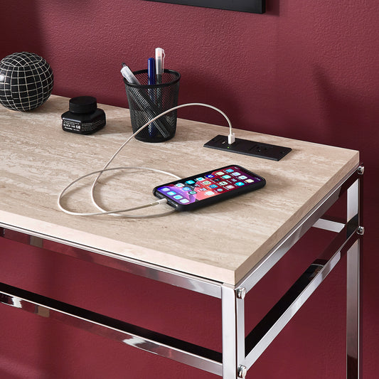 Chrome Finish Counter Height Desk with Faux Marble Top and USB Charging Port