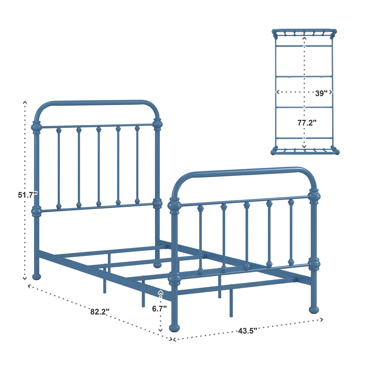 - Twin bed overall dimensions: 82.25 in. length x 43.5 in. width x 51.6 in. height
