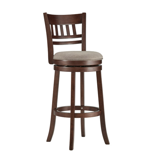 29" Bar Height Slatted Back Swivel Stool - Beige Linen, Cherry Finish