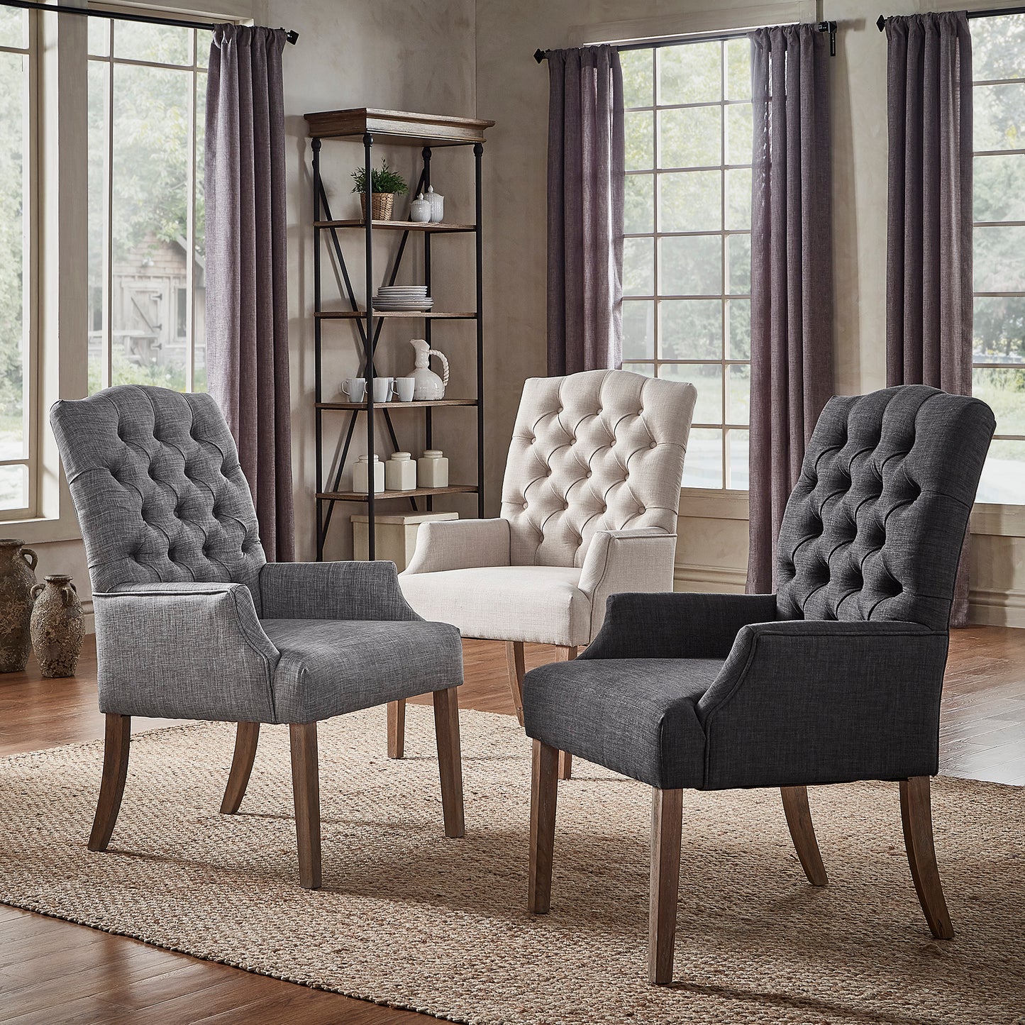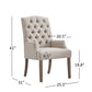 Dine like royalty with the plush features of the iNSPIRE Q Highland light distressed natural finish linen tufted dining chair. A full upholstered and cushioned seat features deep button tufting and prominent arm rests so guests can dine in luxurious comfort, while the light distressed finish of the natural wood legs adds a rustic element to your formal setting that blends seamlessly with various décor styles.