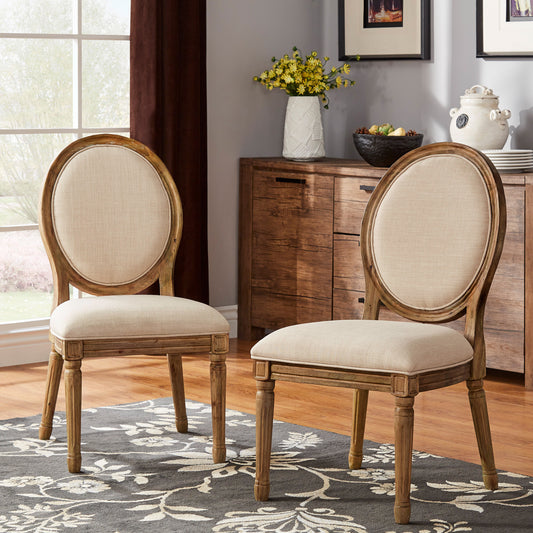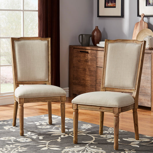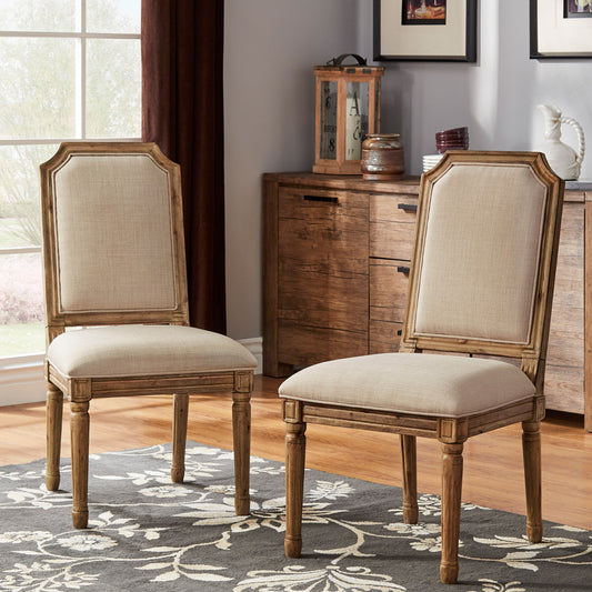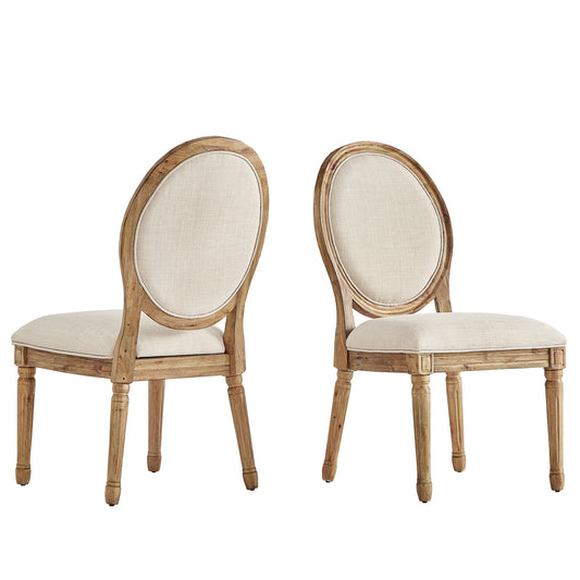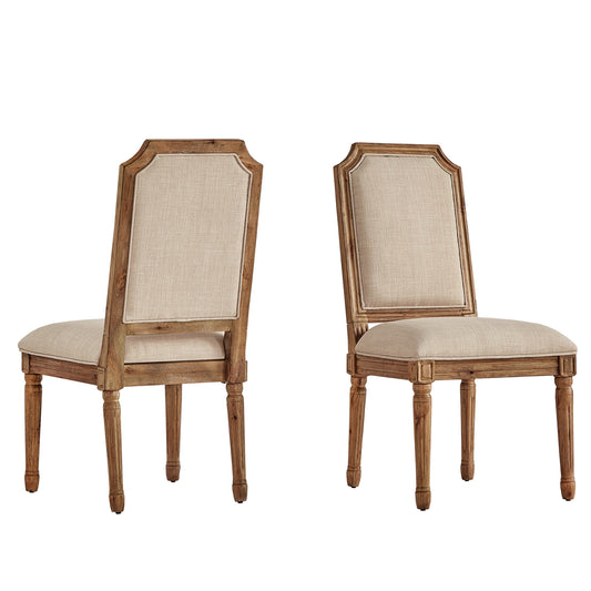 Ornate Linen and Wood Dining Chairs (Set of 2) - Beige Linen, Natural Finish
