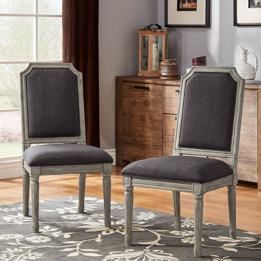 Ornate Linen and Wood Dining Chairs (Set of 2) - Dark Gray Linen, Antique Gray Oak Finish