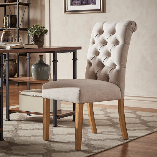 Tufted Rolled Back Parsons Chairs (Set of 2) - Brown Finish, Beige Linen