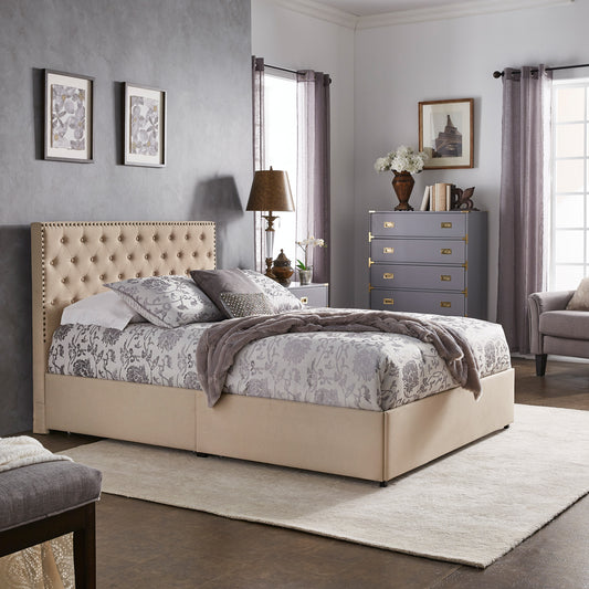 Nailhead Linen Headboard Storage Platform Bed - Beige Linen, Queen (Queen Size)