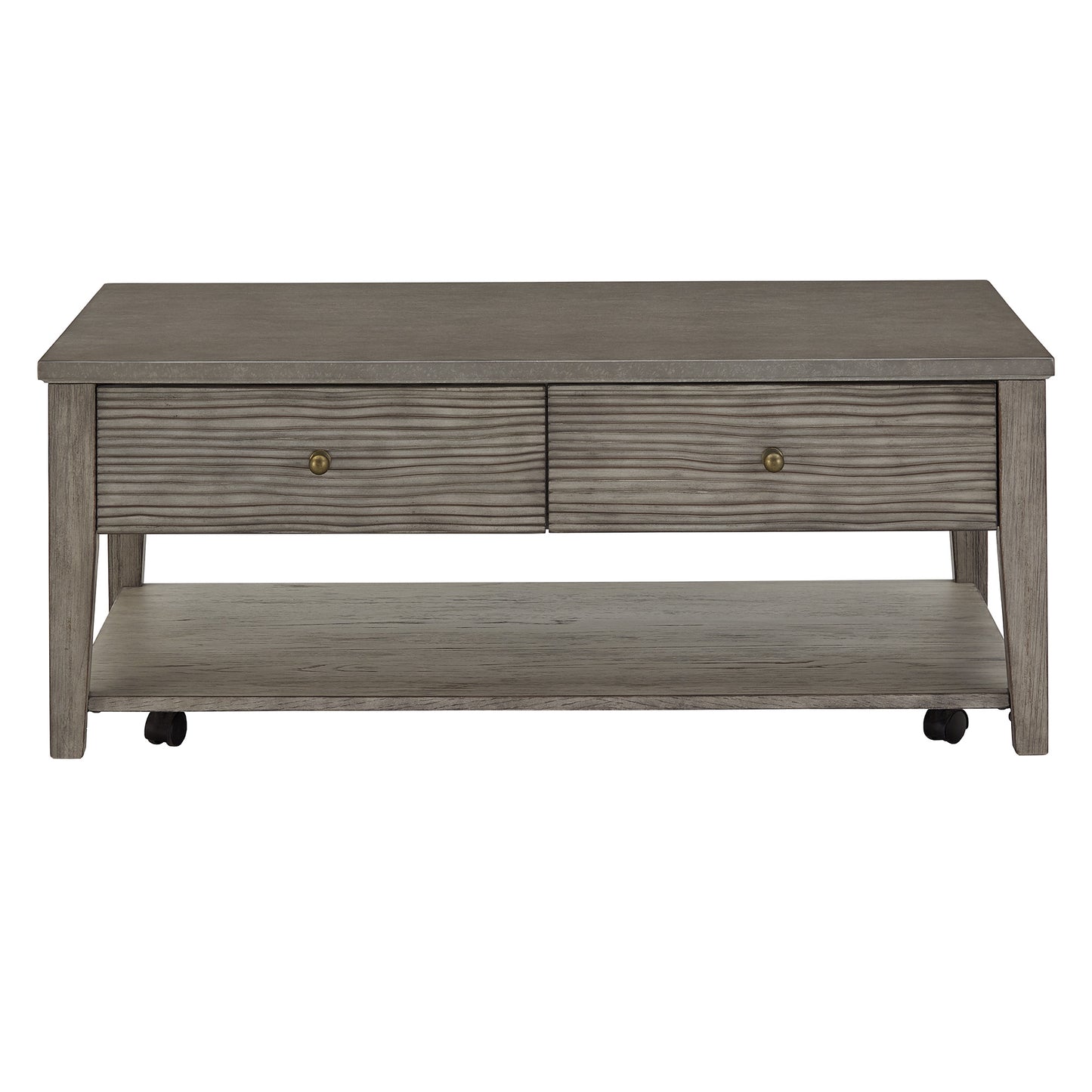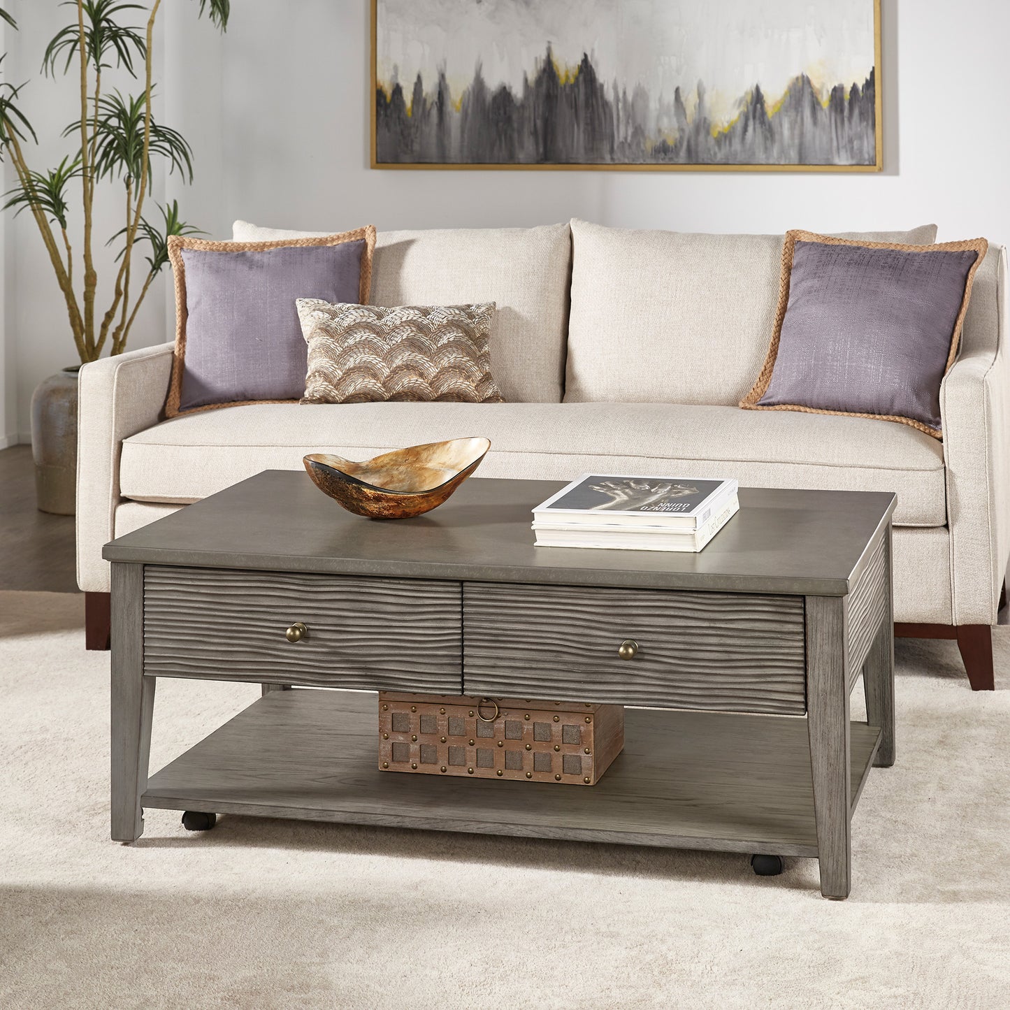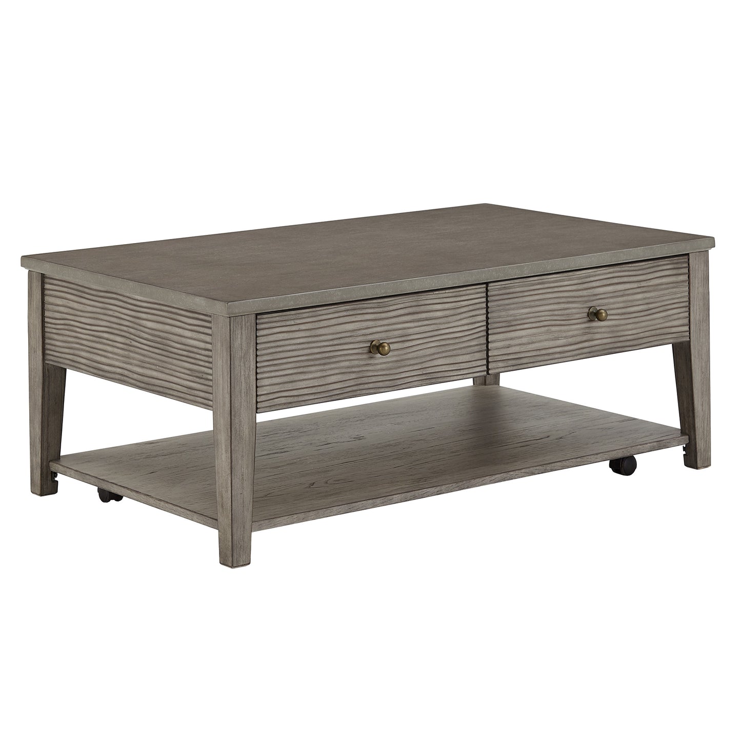 Step into a world of rustic elegance with our Antique Gray Finish Coffee Table. This table is a testimony to the fusion of timeless beauty and modern functionality. Its durable fiber cement top and textured side panels make it a living room centerpiece. The convenience of four castors, a storage drawer, and an open shelf makes it as practical as it is stylish. Crafted from a blend of top-notch materials, it's an investment in style and durability.