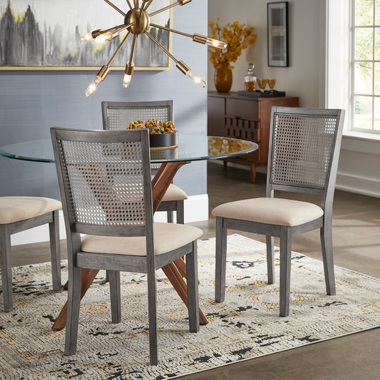 Antique Grey Beige Linen Rattan Back Dining Chairs (Set of 2)