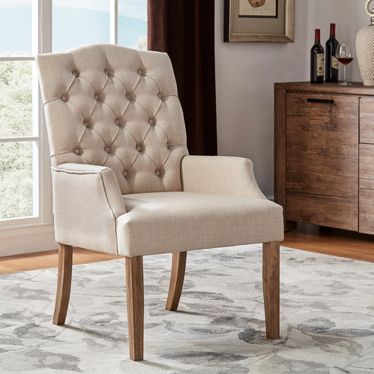 Light Distressed Natural Finish Linen Tufted Dining Chair - Beige Linen