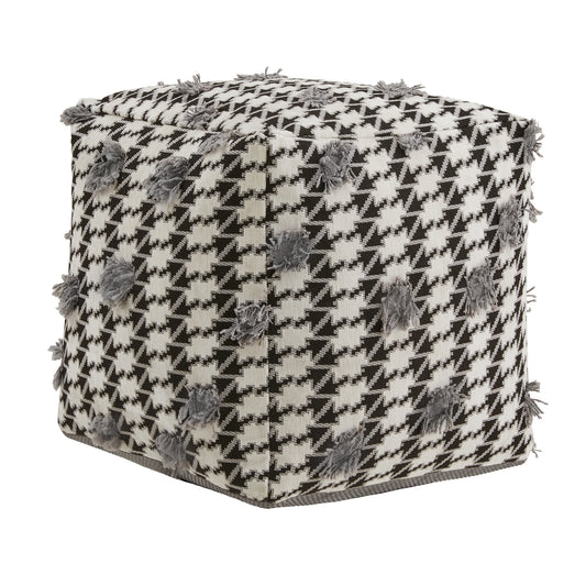 Upholstered Square Pouf Ottoman - Black & White Houndstooth Pattern Fabric With Fringe