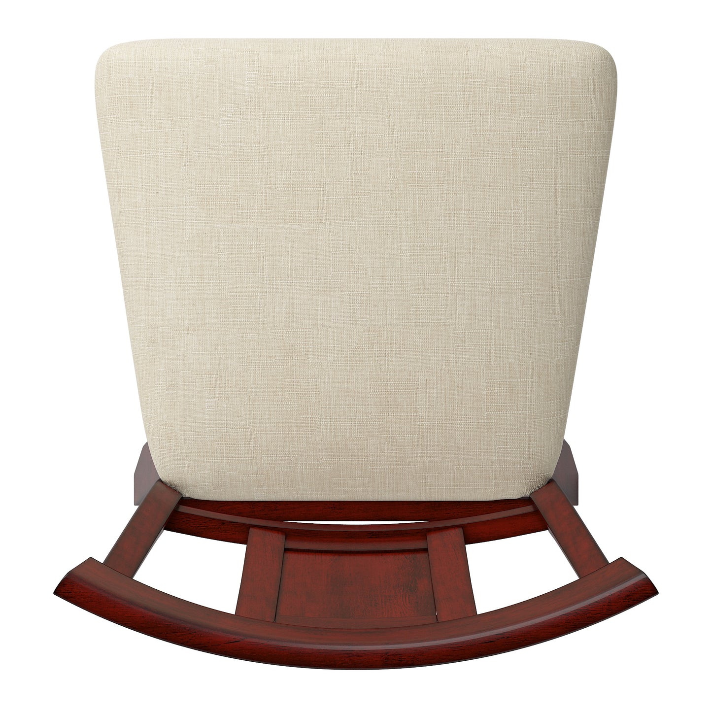- Foam padded seat, beige fabric upholstery, and footrest for added comfort