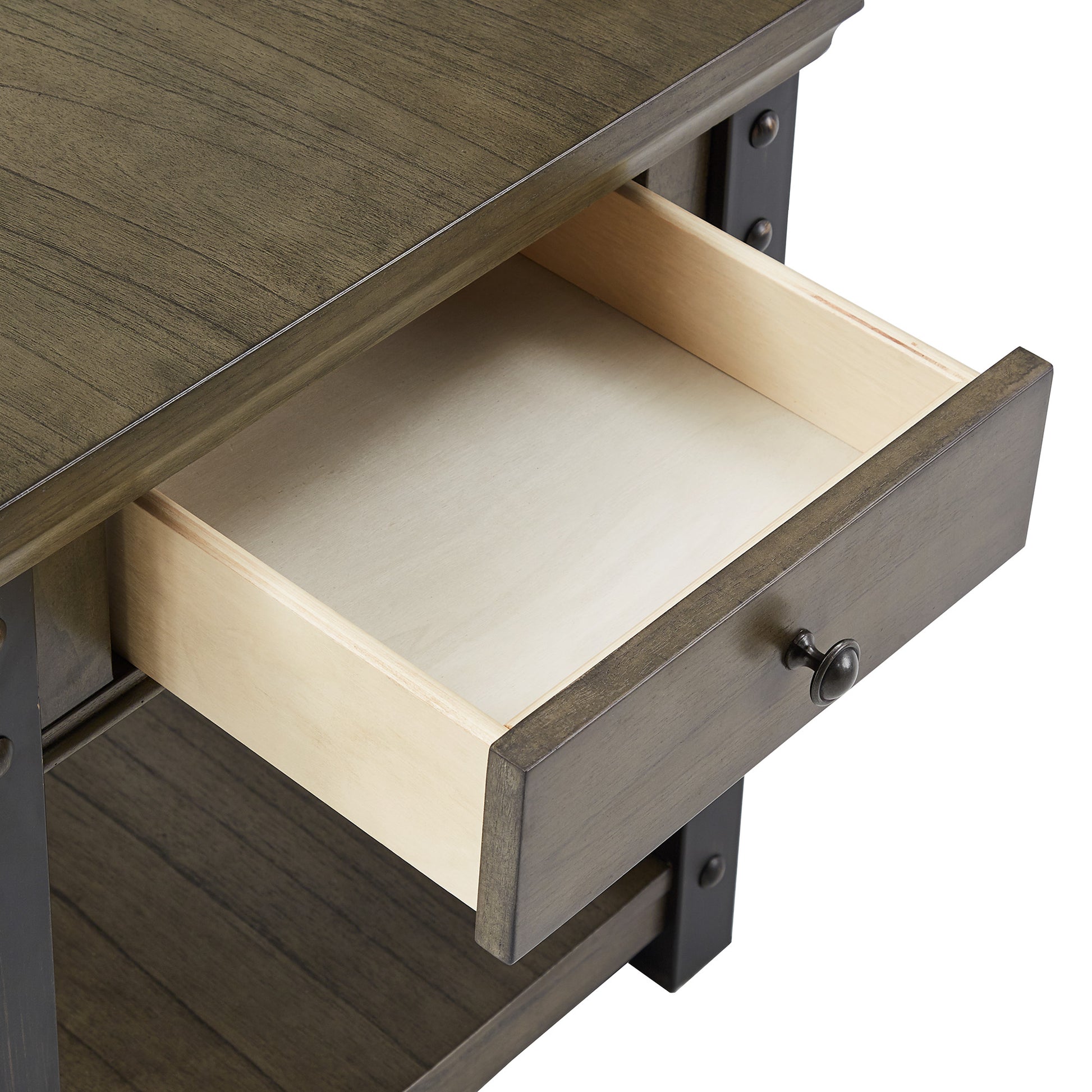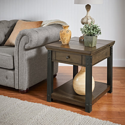 Classic and industrial elements meet to make up the iNSPIRE Q iNSPIRE Q dark wood finish end table with built-in Outlets with USB charging ports. With a rich and smooth wood finish and obvious wood grain pattern, this table is perfect for the cabin's or lake house's living space. A durable, black metal frame holds this piece together and gives the table a slight modern appearance. The single drawer provides secure storage for everyday essentials, while the bottom shelf space offers up space to stack books or magazines. An included power outlet ensures your phone or electronic accessories remain charged and ready to go for the day, making this table both beautiful and functional.