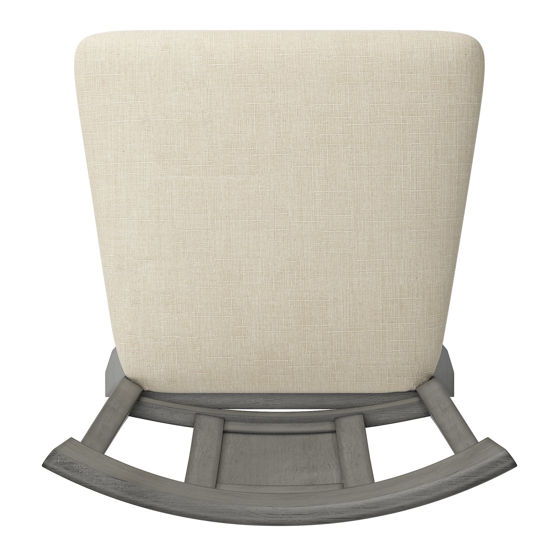- Foam padded seat, beige fabric upholstery, and footrest for added comfort