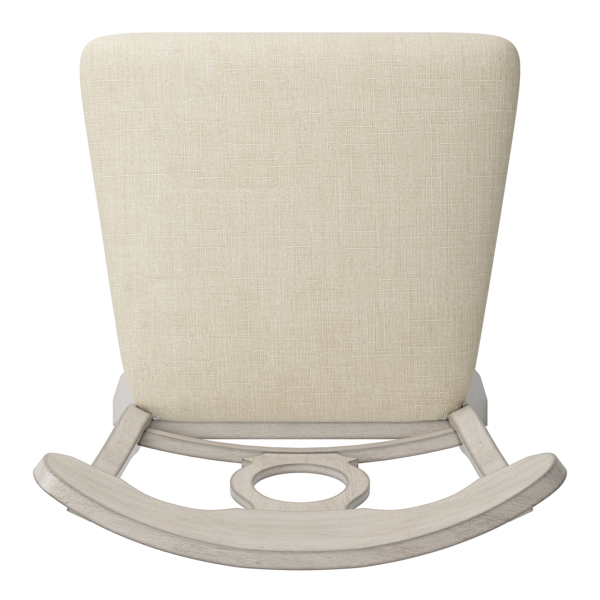 - Features a padded seat, beige fabric upholstery, and footrest for added comfort