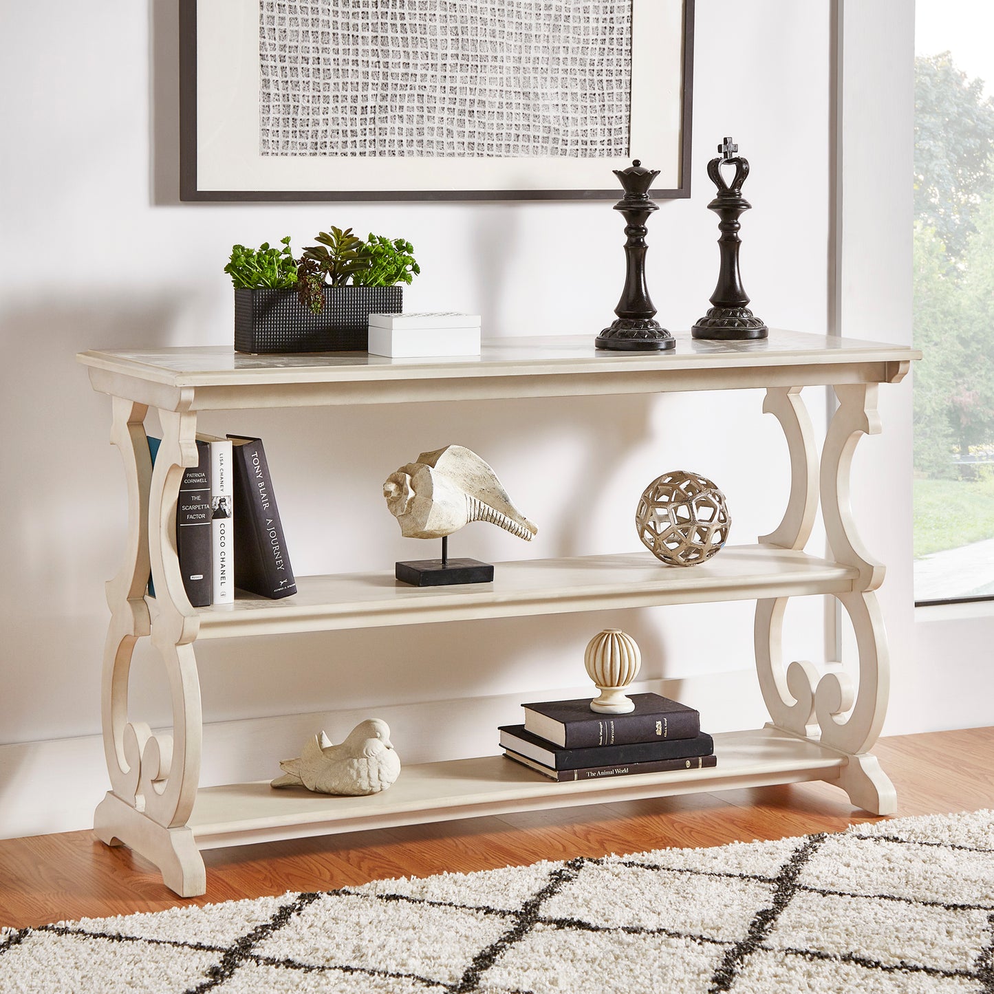 Give your living room, entryway, foyer, or hallway an elegant and traditional flair with this iNSPIRE Q sofa table from iNSPIRE Q Classic. The graceful wood scroll work and visible wood grain create rustic touch that's perfect for any country, vintage, or antique style. With a three-tiered design, you'll have plenty of space for books, magazines, decorative items, and more.
