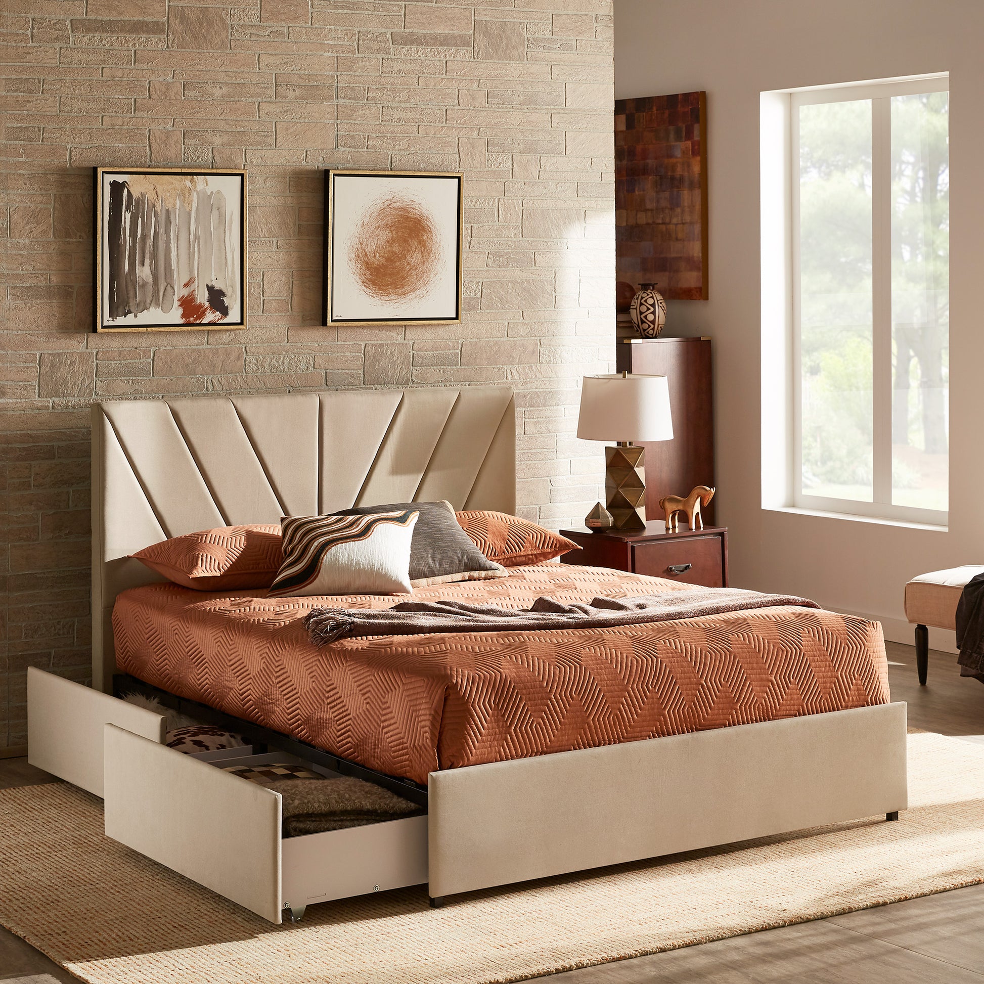 The iNSPIRE Q V-Channel Headboard Storage Platform Bed by iNSPIRE Q Modern is a stylish addition to any bedroom. This bed displays a channel-style headboard in a V shape for visual interest. Beige linen upholstery softens the piece yet adds sophistication. Store all your bedroom essentials in the four spacious drawers. A sturdy wooden construction will have you sleeping soundly for years to come.