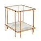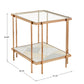 Elevate your living room décor with this luxurious Champagne Gold Finish Glass End Table. Designed with a geometric marble pattern on its lower shelf, this two-tier table offers both style and practicality. The frame’s champagne gold finish exudes elegance, while the clear tempered glass top provides a minimalist aesthetic that enhances your interior. Whether placed next to a sofa or used to display décor, this versatile end table serves as the perfect modern accent piece for your home. The unique combination of materials—glass, and iron—adds character and warmth to any room setting.