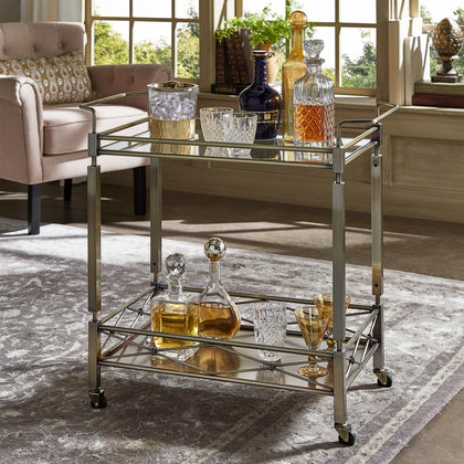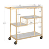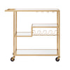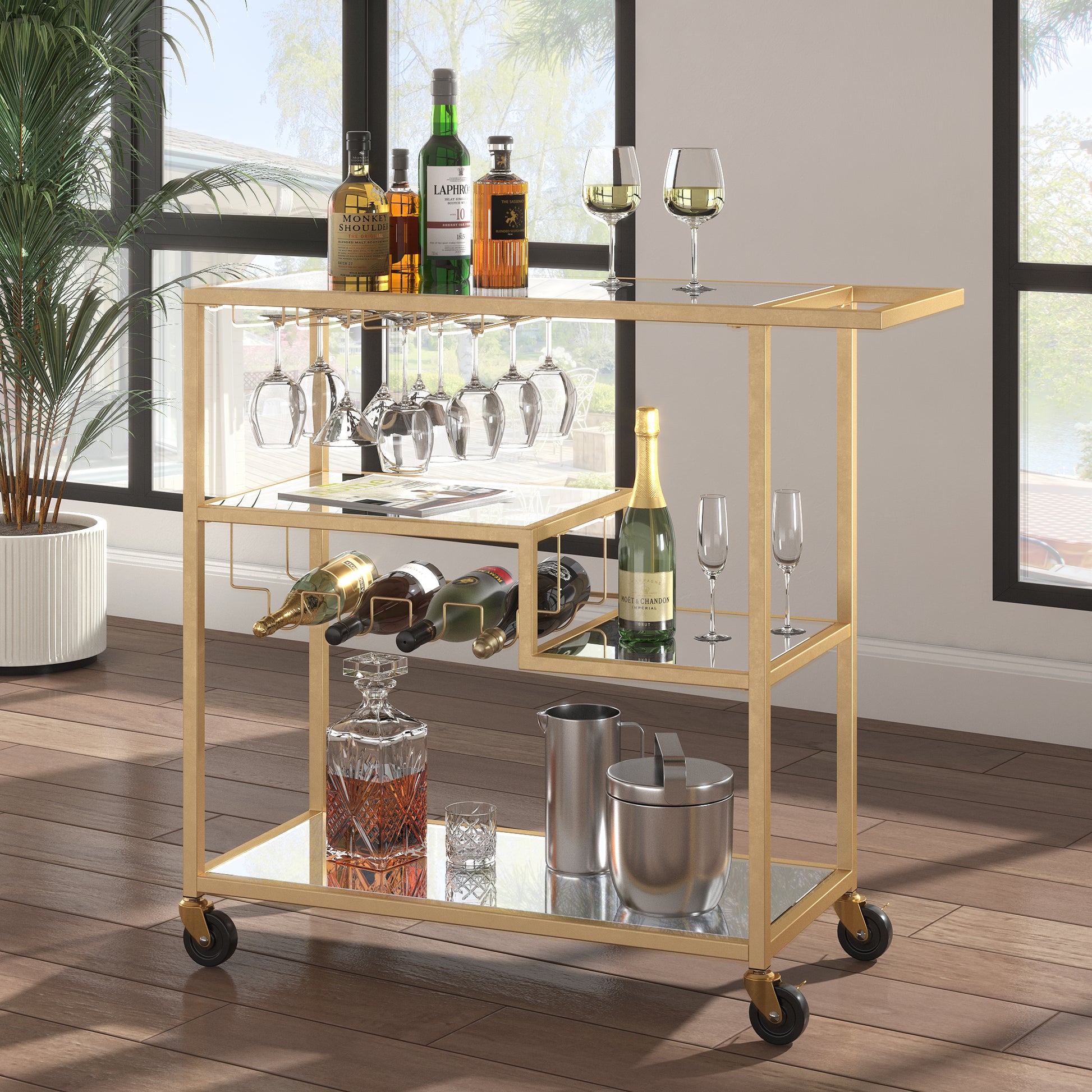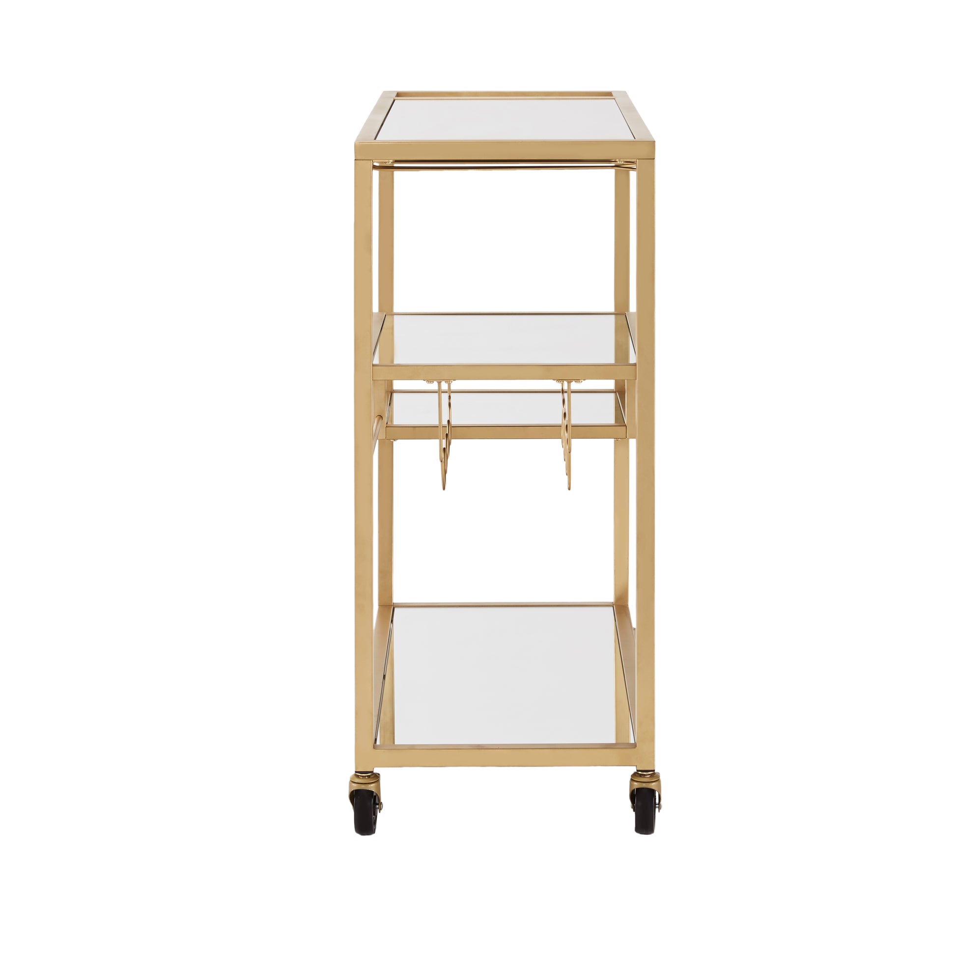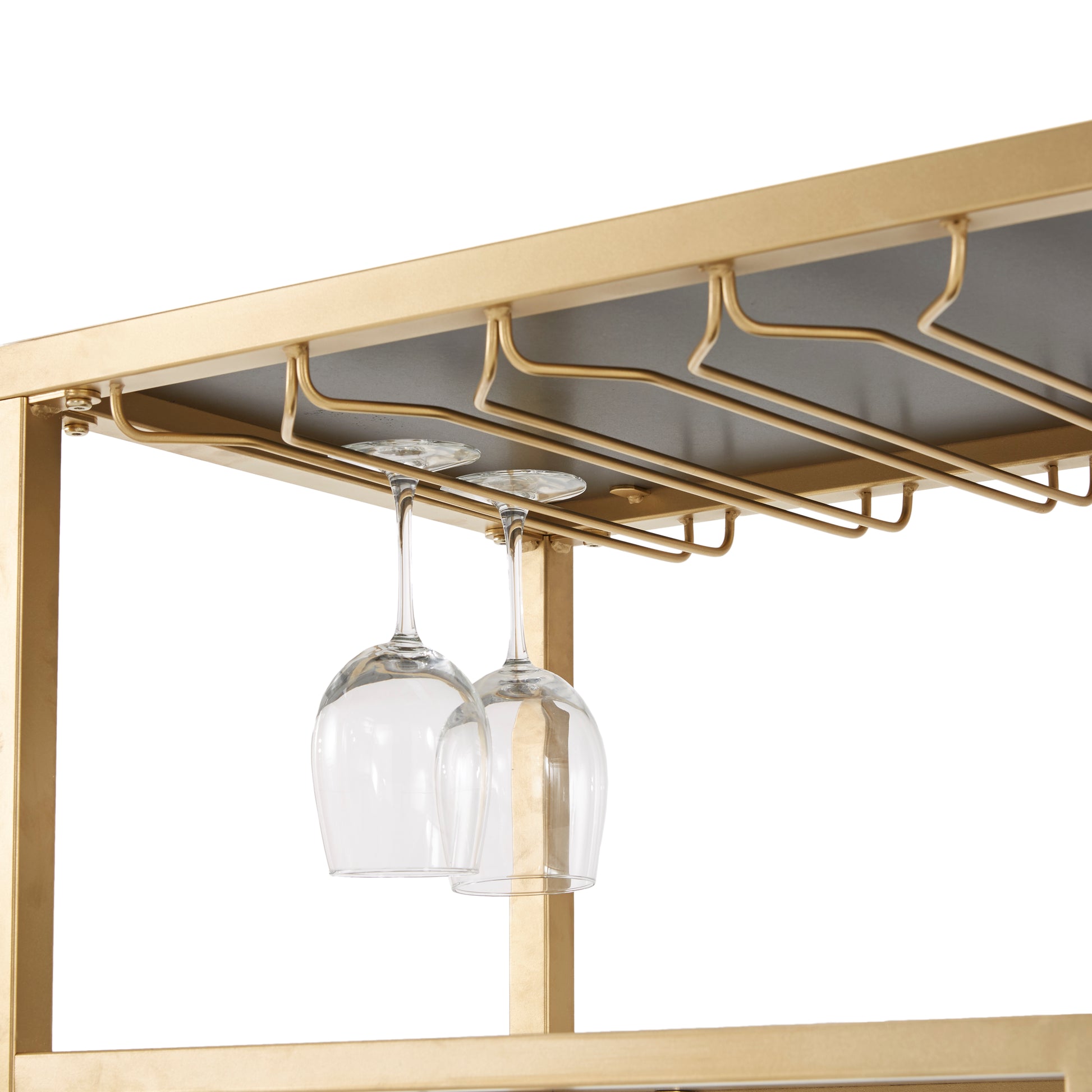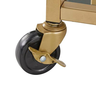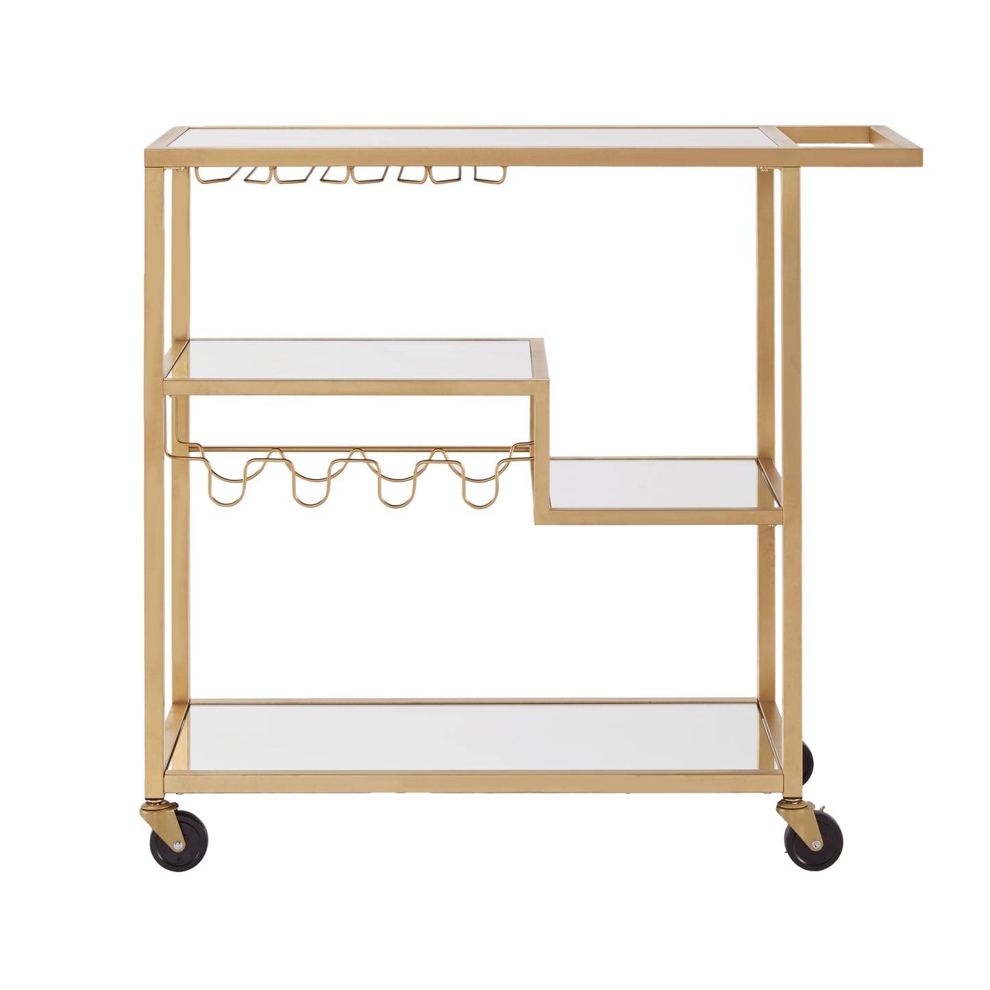 Clean and modern with a touch of glam, the iNSPIRE Q Bar Cart from iNSPIRE Q Bold is sure to make a statement with your guests. This piece is both stylish and functional, featuring wheels for easy handling and plenty of space for all your hosting needs, including a wine rack that can hold four bottles. The glass shelves will add a little sparkle and shine to your dining experience.
