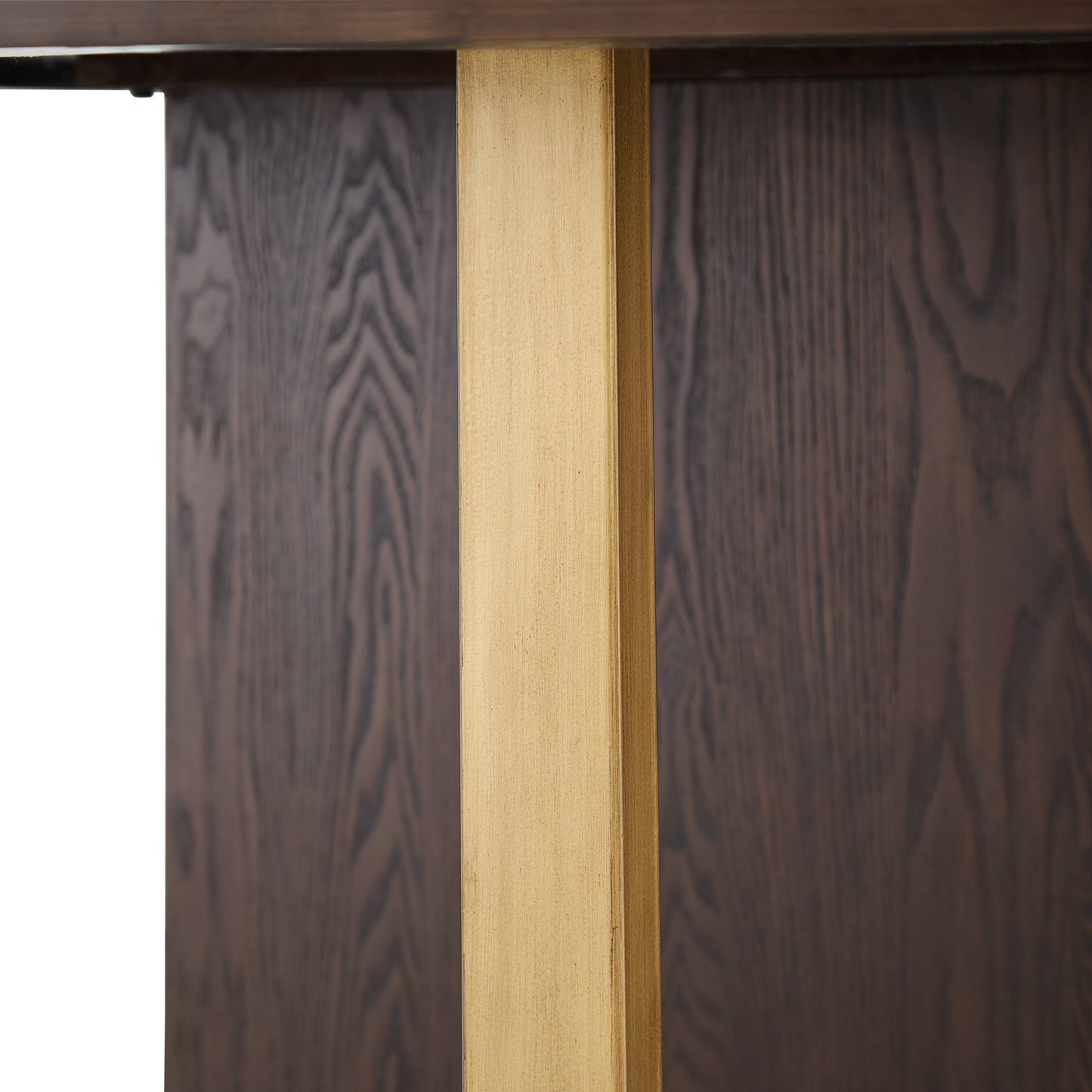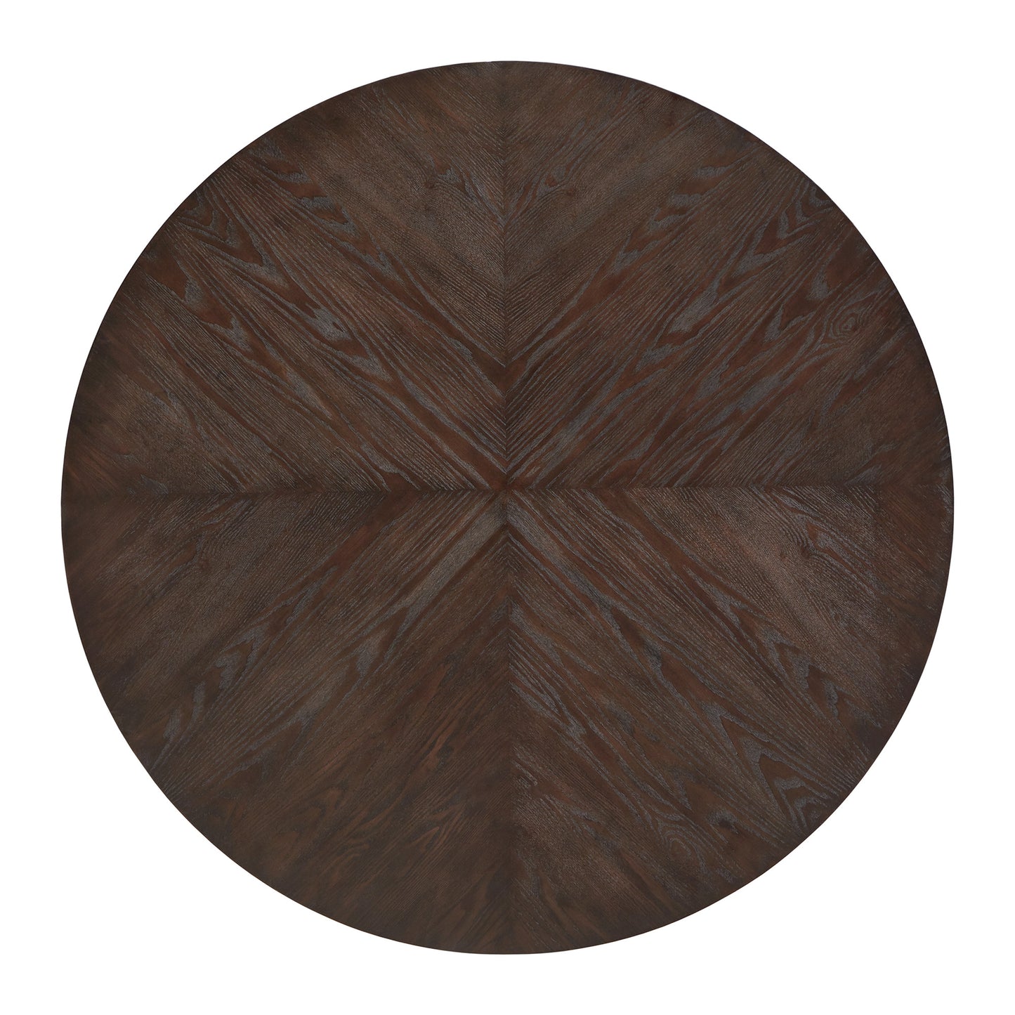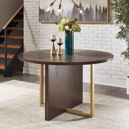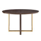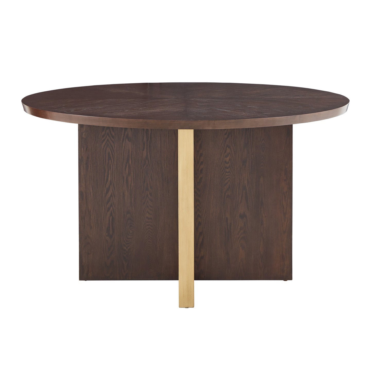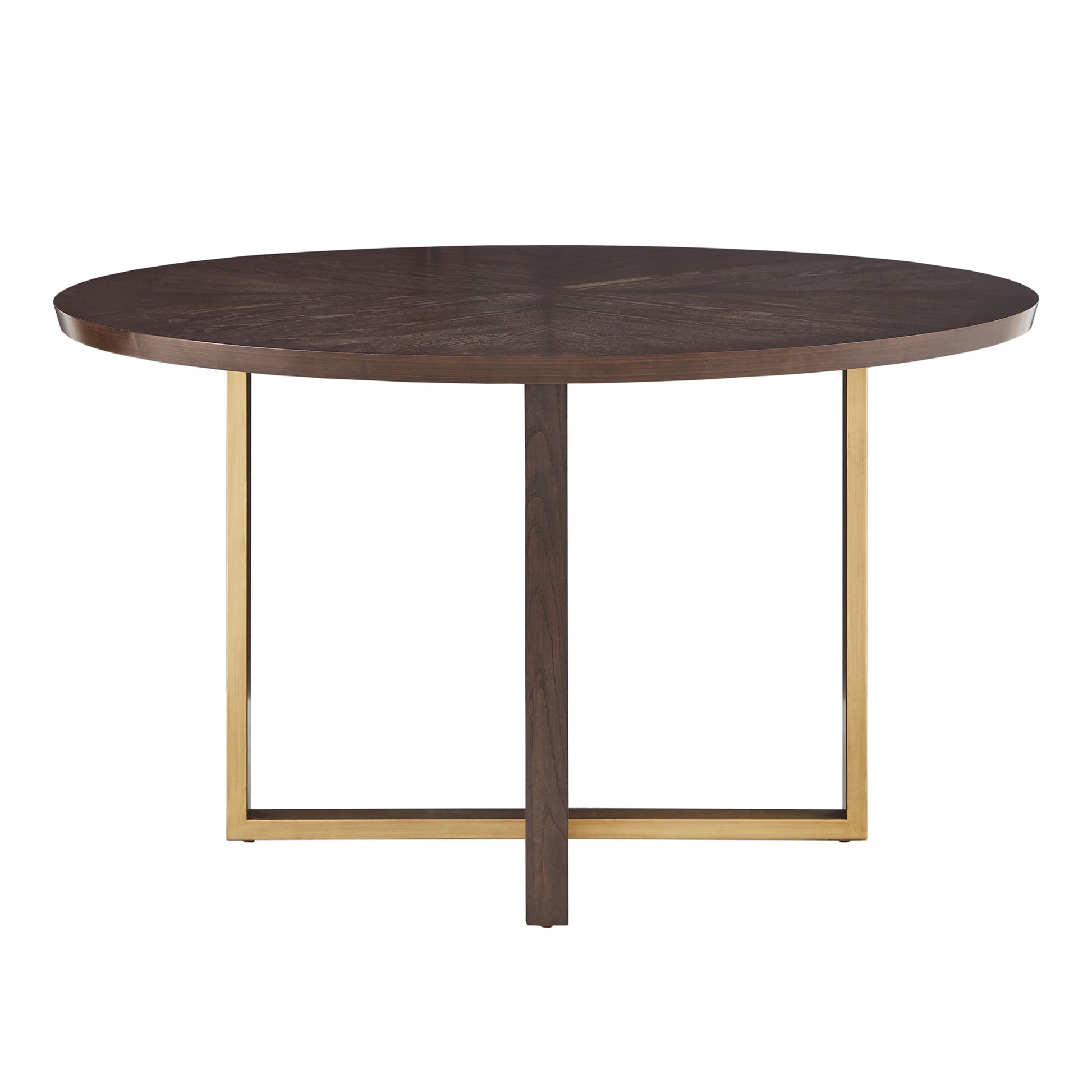 The iNSPIRE Q Espresso 54-inch Round Dining Table by iNSPIRE Q Modern updates your formal dining room with contemporary elegance. Coming in a warm, espresso finish, this sturdy table features a stunning inlay design on the oak veneer table top and gold metal bars to make this piece truly unique. This reliable table is crafted from rubberwood, making it easy to clean yet hard to scratch.