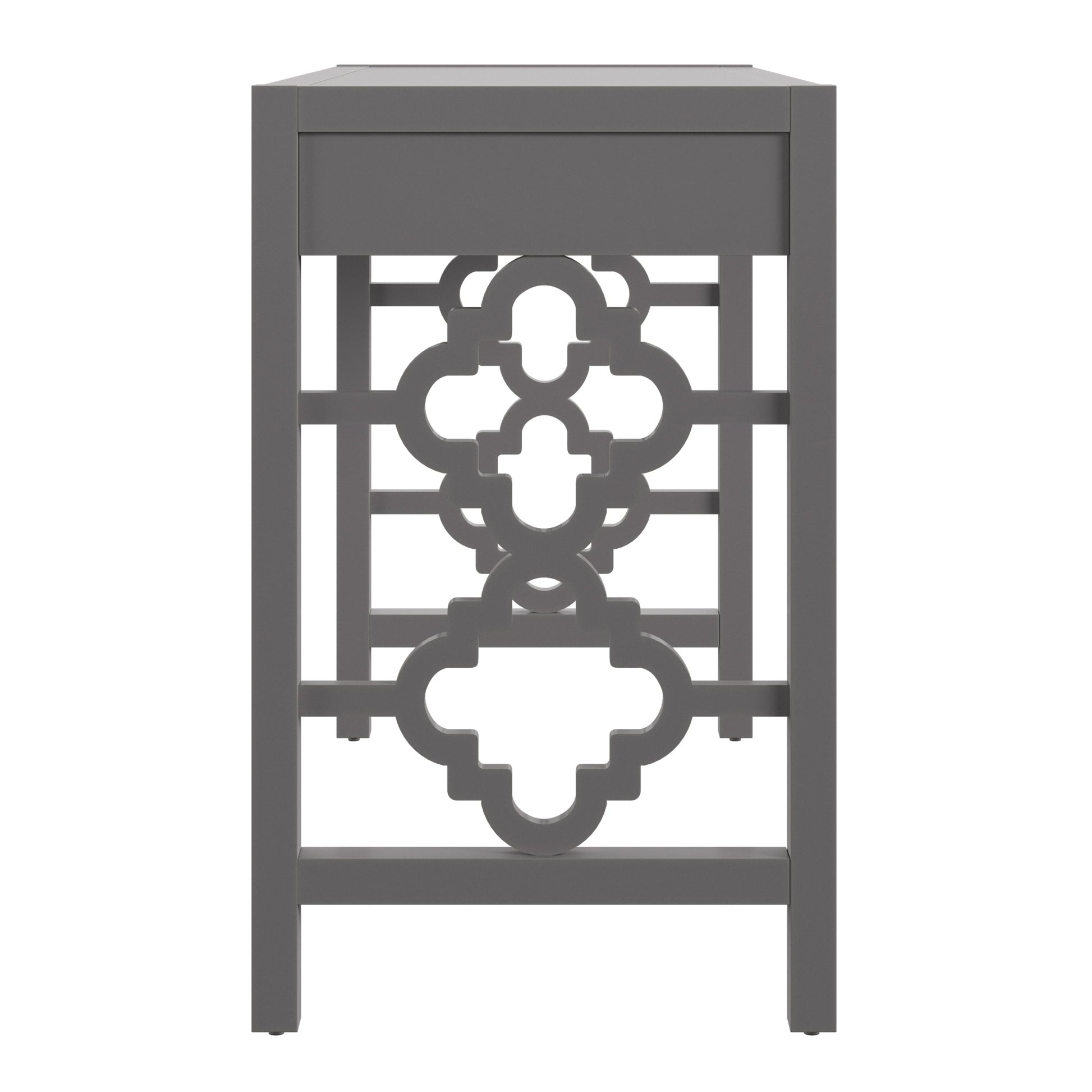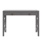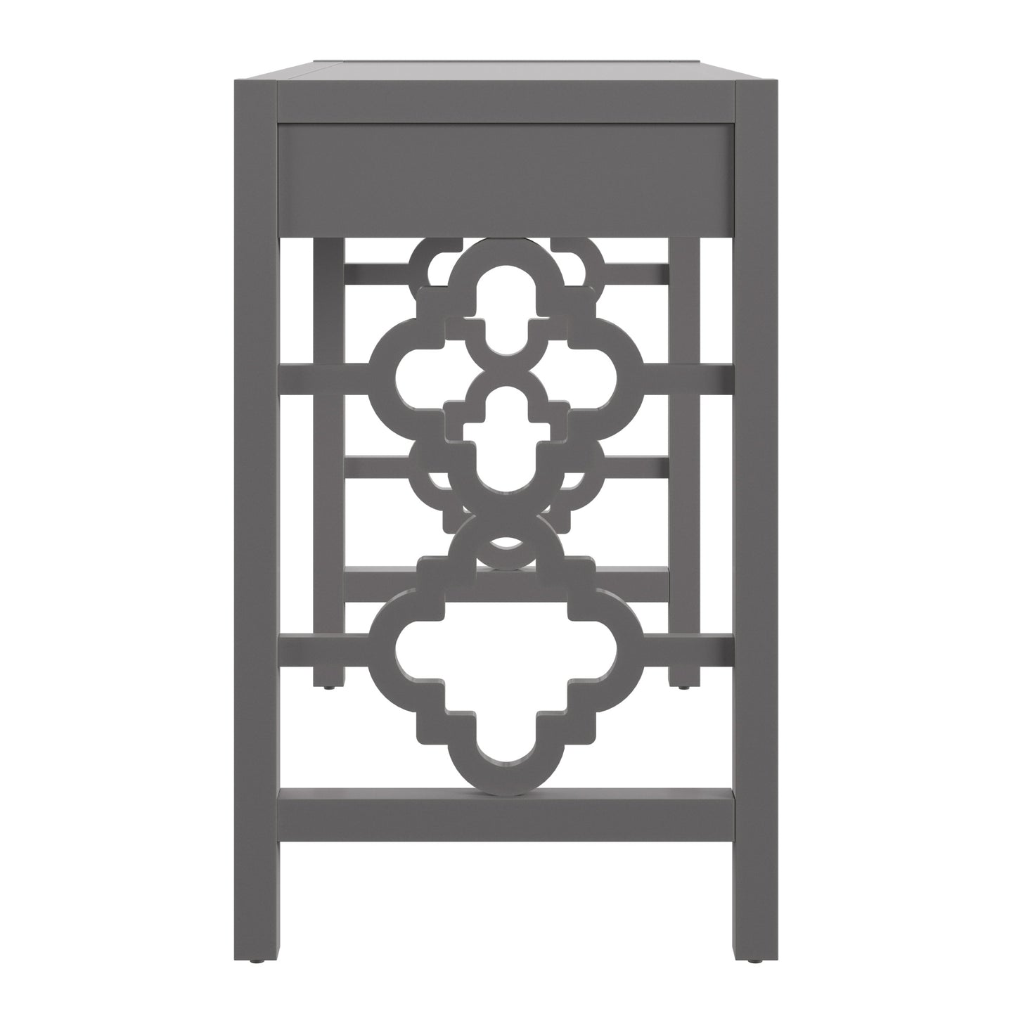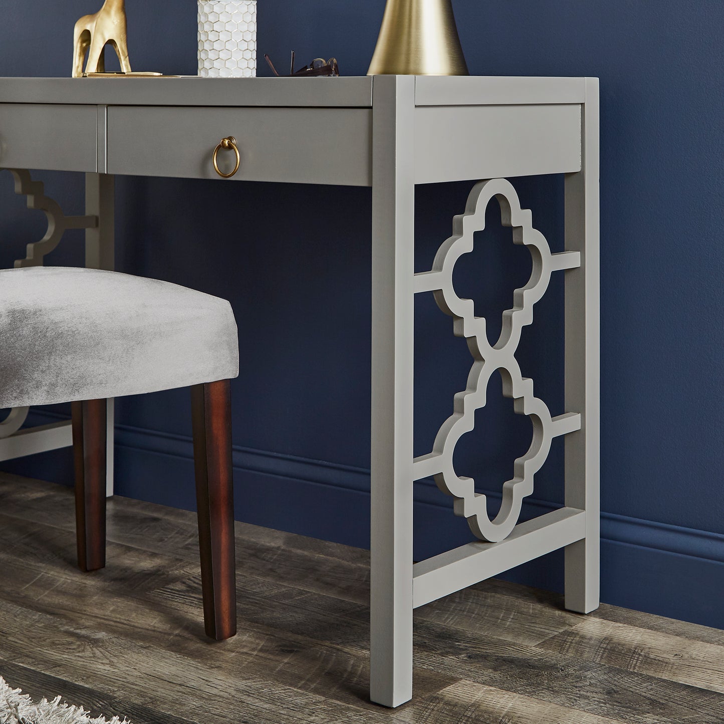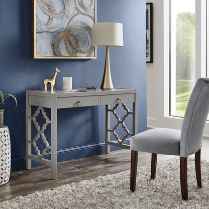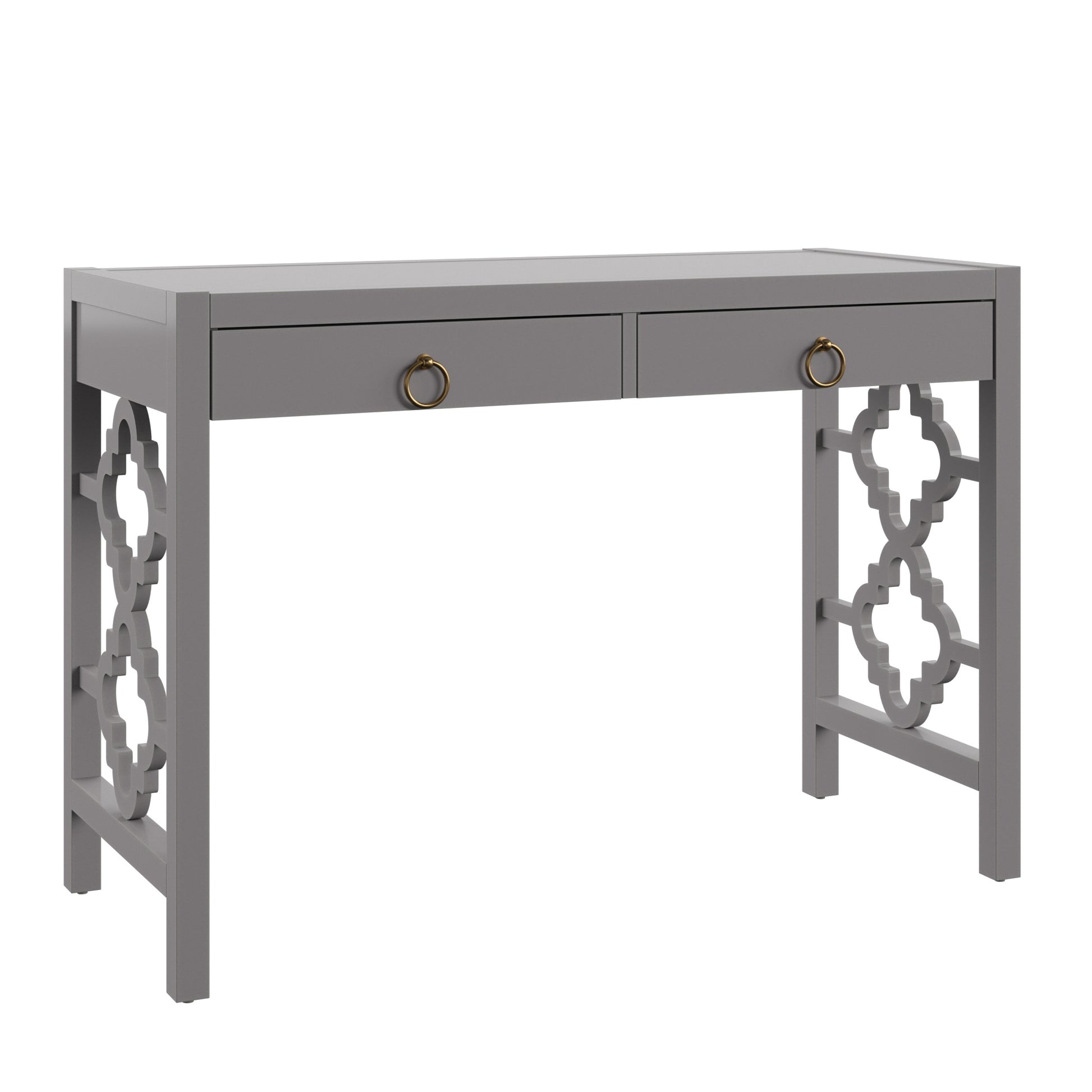Complete your office space with the iNSPIRE Q writing desk by iNSPIRE Q Classic. Cut-out quatrefoil designs add striking accents on the side of the desk. The space-saving design features two drawers with brass finish ring drawer pulls, for plenty of storage without compromising stylish sophistication. The durable construction offers lasting use and goes perfectly with styles from modern glam to transitional. Create a chic work space with a desk that will fit perfectly with your space.