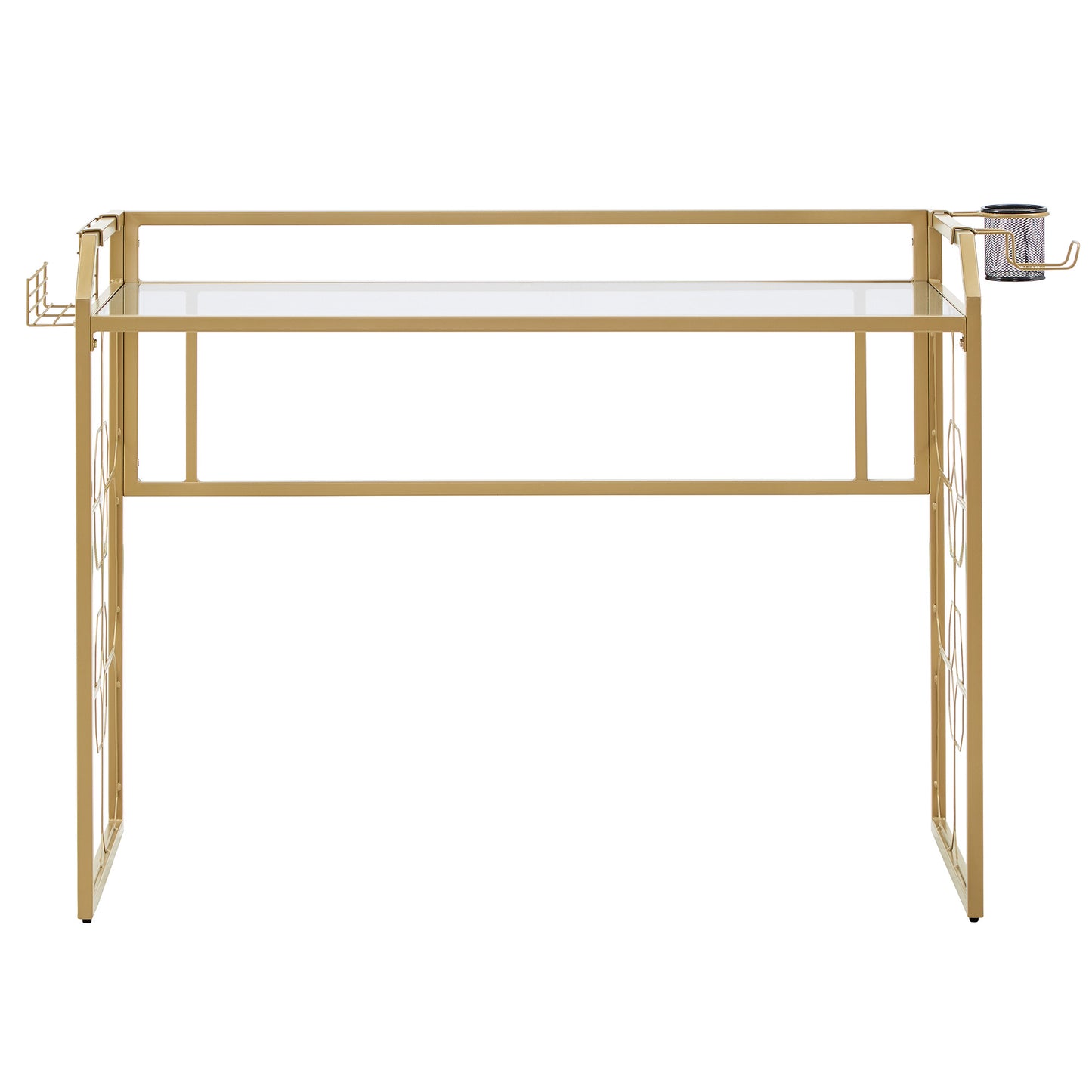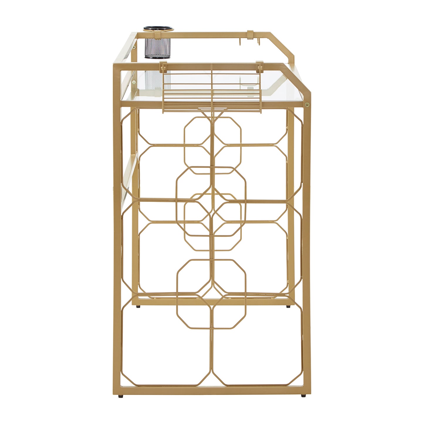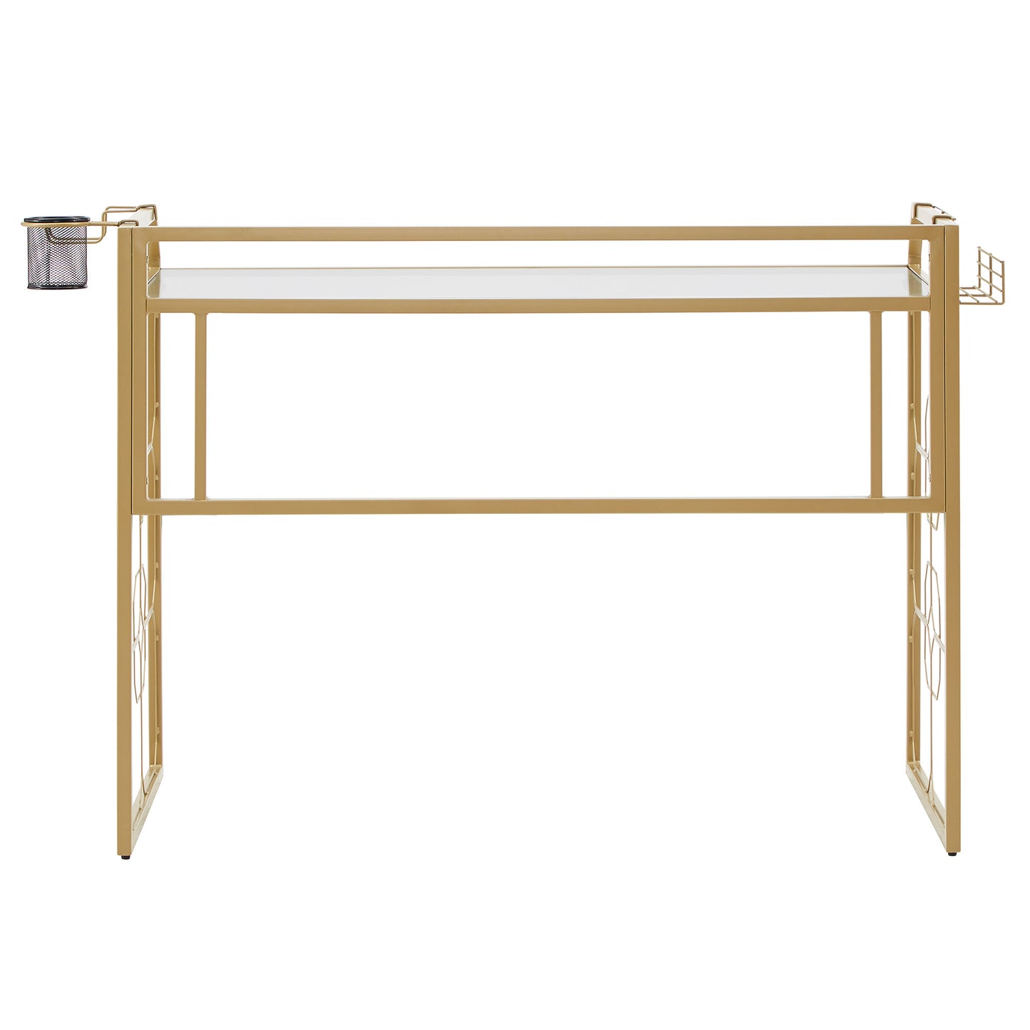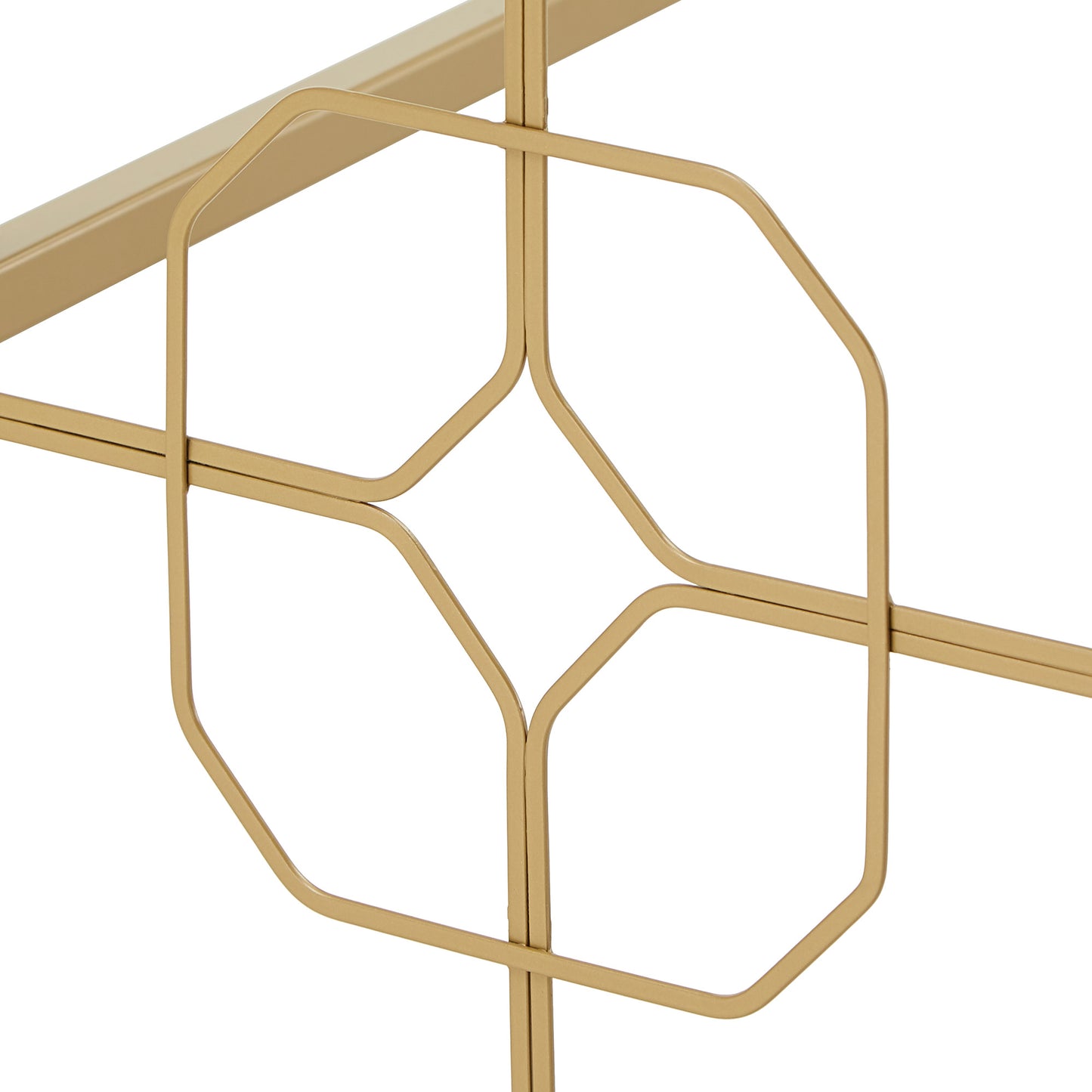 Deliver a look of sophisticated elegance with the iNSPIRE Q Octagon Pattern Gold Metal and Glass Desk by iNSPIRE Q Bold. Framed with sturdy, gold, powder-coated metal, this stunning piece features ornamental, octagonal designs along the sides. The spacious table top is made with clear, tempered glass, enhancing the eye-catching aesthetic. This unique piece is perfect for any glam or eclectic design styles.