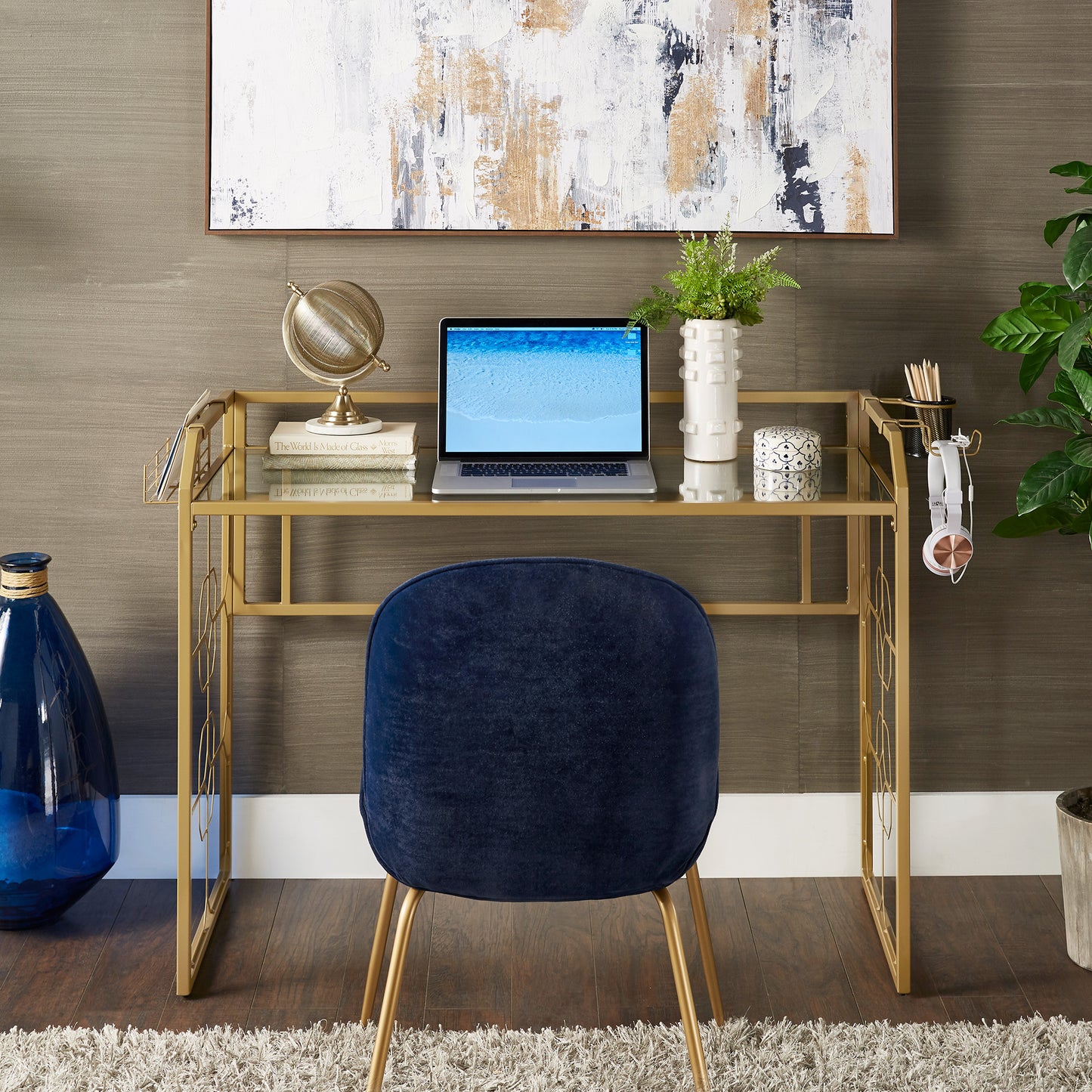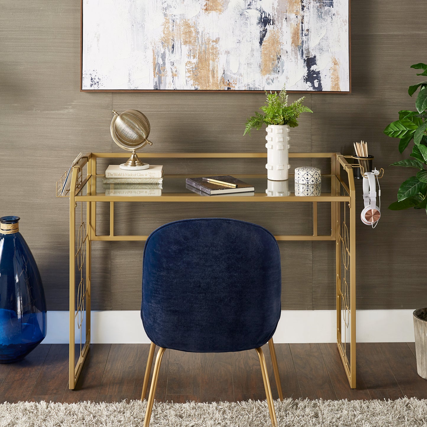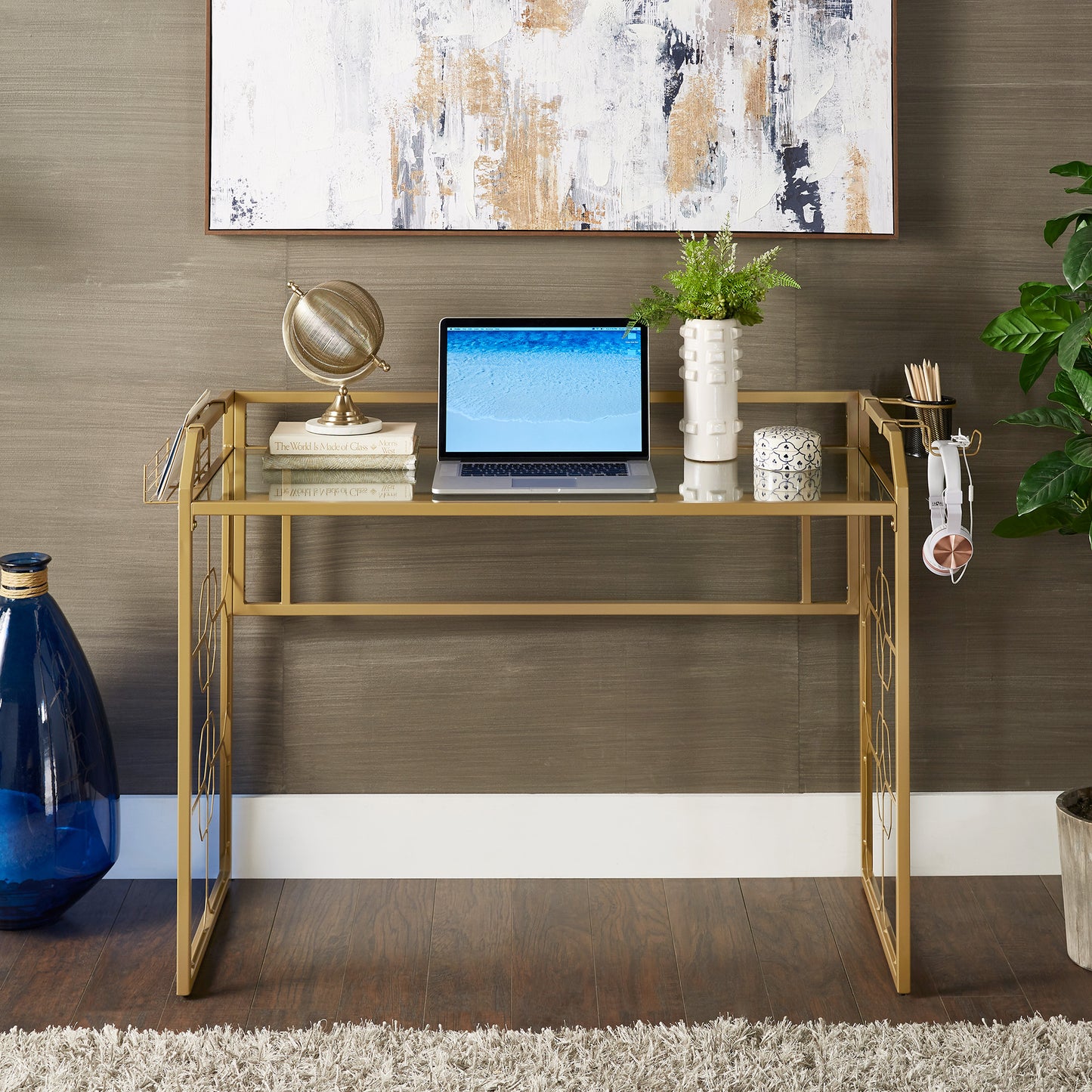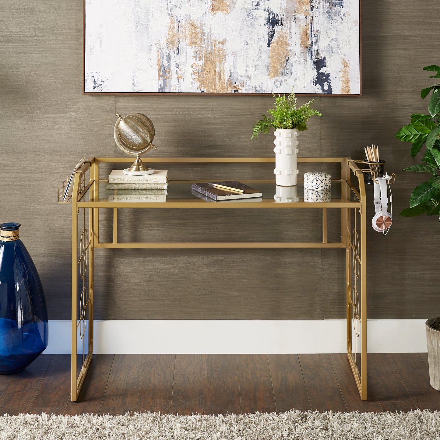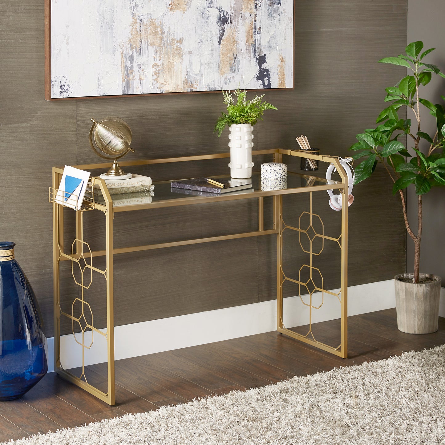 Deliver a look of sophisticated elegance with the iNSPIRE Q Octagon Pattern Gold Metal and Glass Desk by iNSPIRE Q Bold. Framed with sturdy, gold, powder-coated metal, this stunning piece features ornamental, octagonal designs along the sides. The spacious table top is made with clear, tempered glass, enhancing the eye-catching aesthetic. This unique piece is perfect for any glam or eclectic design styles.