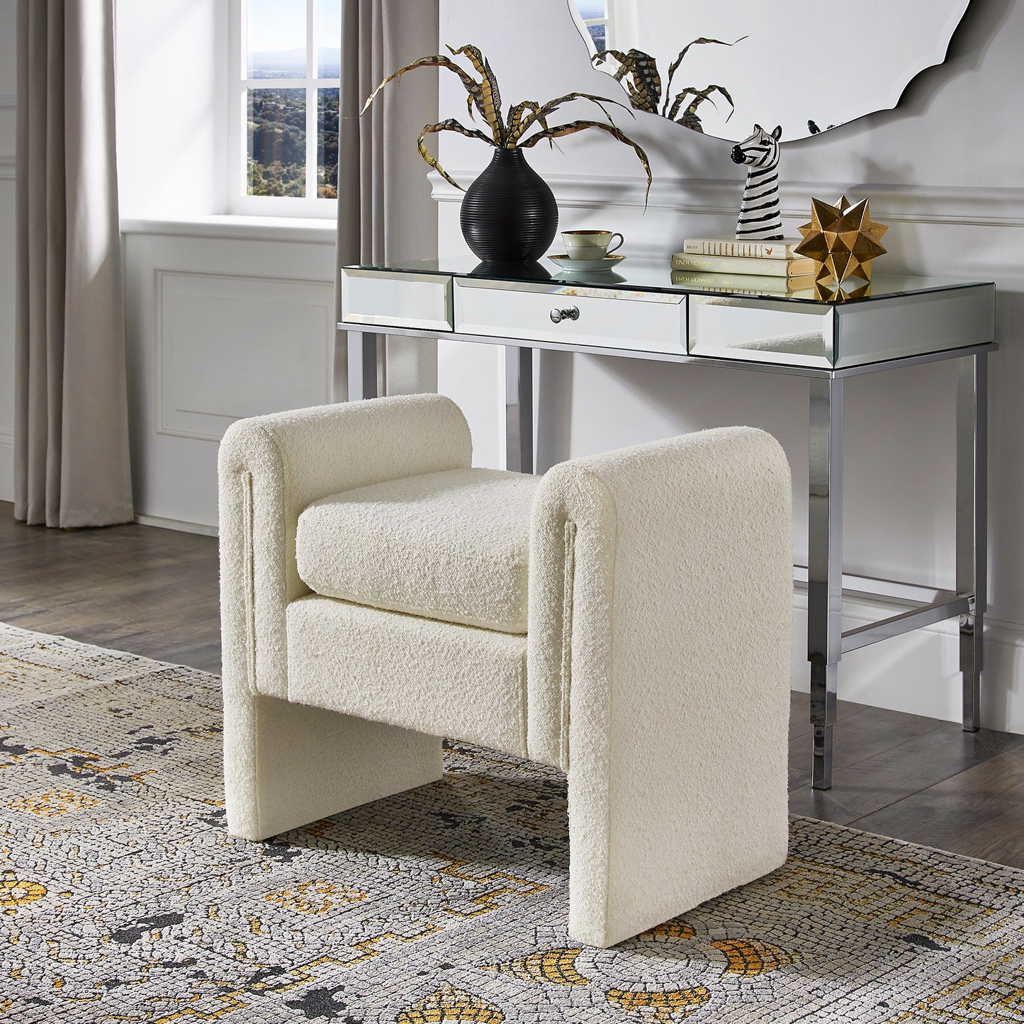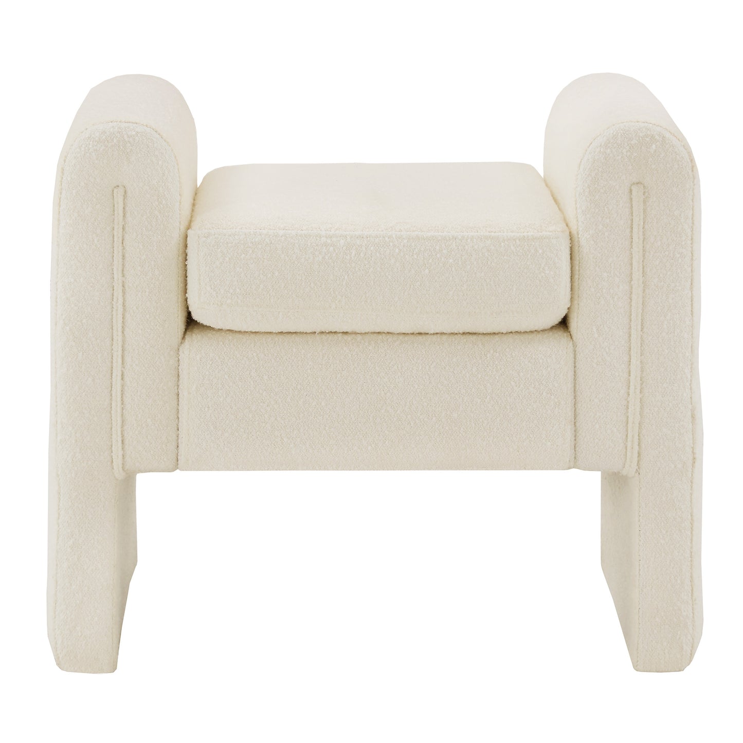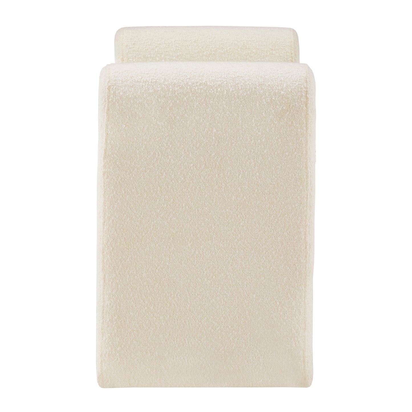 Introducing the modern Ivory White Boucle Bench, the perfect fusion of contemporary design and everyday comfort tailored for the urban lifestyle. Crafted with a sturdy iron tube framework and a solid MDF base, this bench promises endurance and stability. The seat's comfort is amplified by a polyurethane foam pad and enrobed in a layer of soft polyester fiber batting, offering a seating experience that's both indulgent and supportive. Its boucle fabric upholstery is not only on-trend but provides a tactile allure that enhances any room's aesthetic. Designed with curved arms for armrest support, this piece is versatile enough to serve as a chic vanity chair, a welcoming entrance seat, or a functional ottoman. Make a bold statement in your modern living space with this luxurious boucle bench.