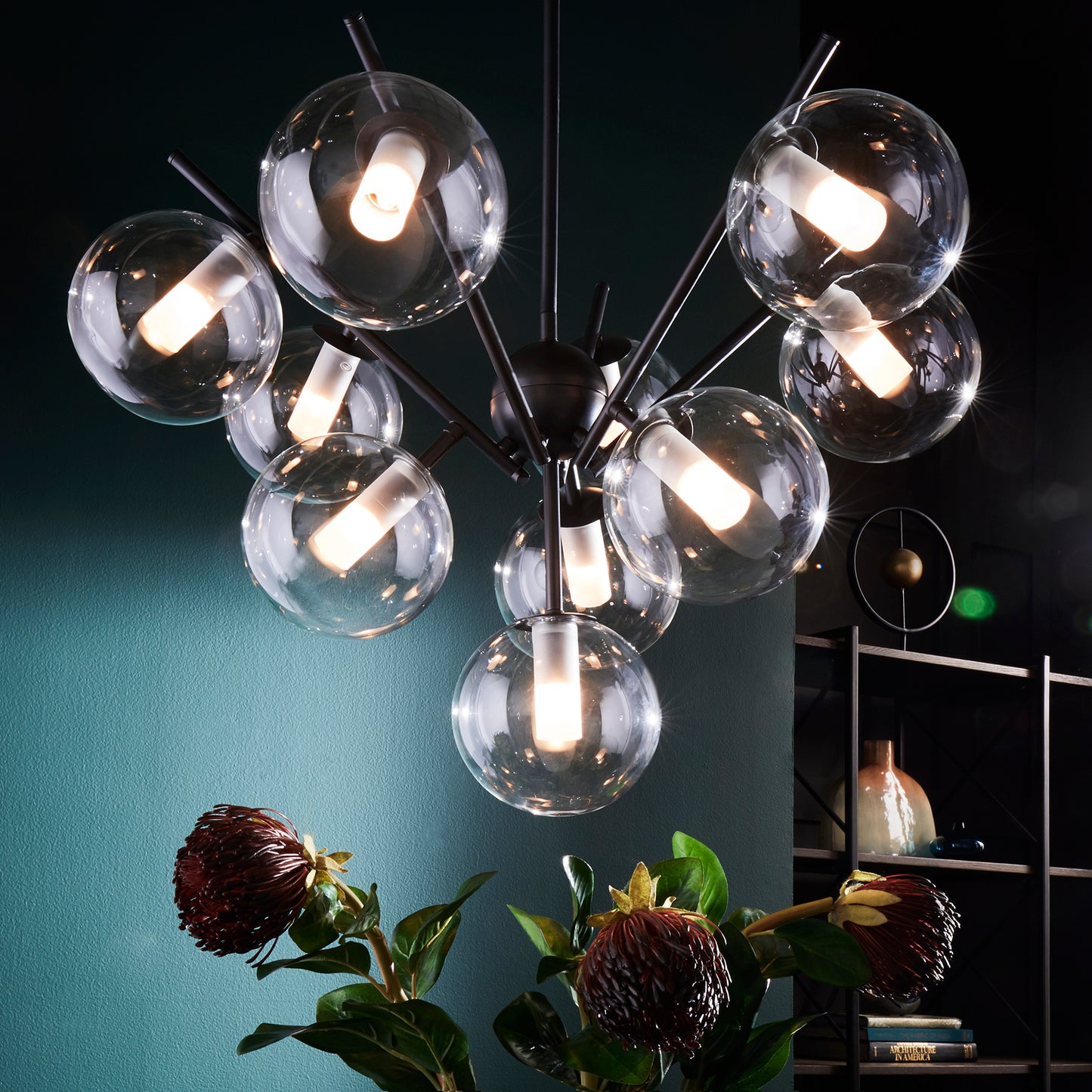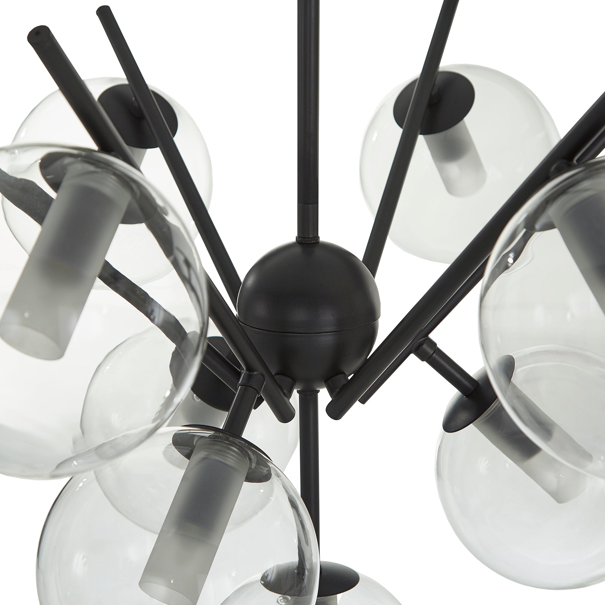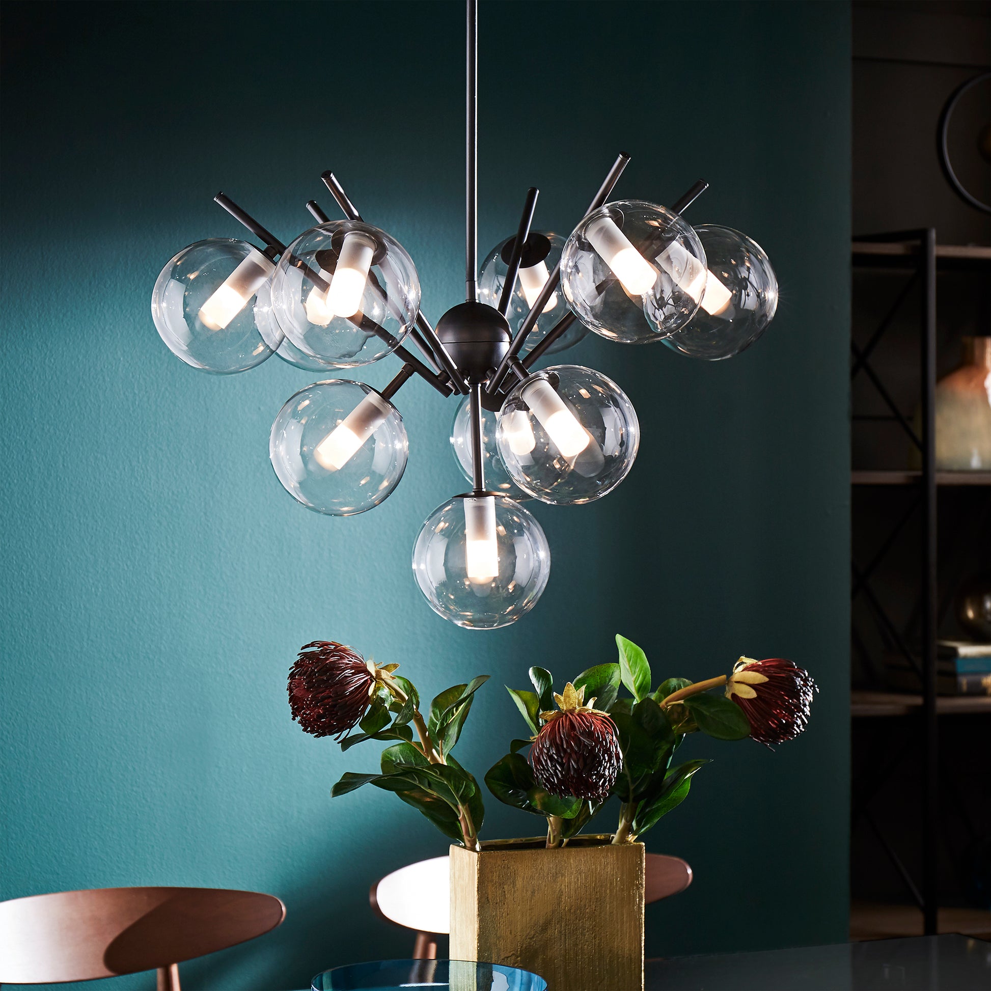 Serving as a simple, final touch to your dining room or living space, the iNSPIRE Q iNSPIRE Q Matte Black Bold 10-Glass Globe Pendant Light provides just the right amount of needed light to illuminate your space. This light conveniently hangs from the ceiling, features a sleek, matte black finish with 10 clear glass globes. This 10 bulb light fixture adds modern beauty to any room in the home and provides the perfect mood lighting for an intimate setting.