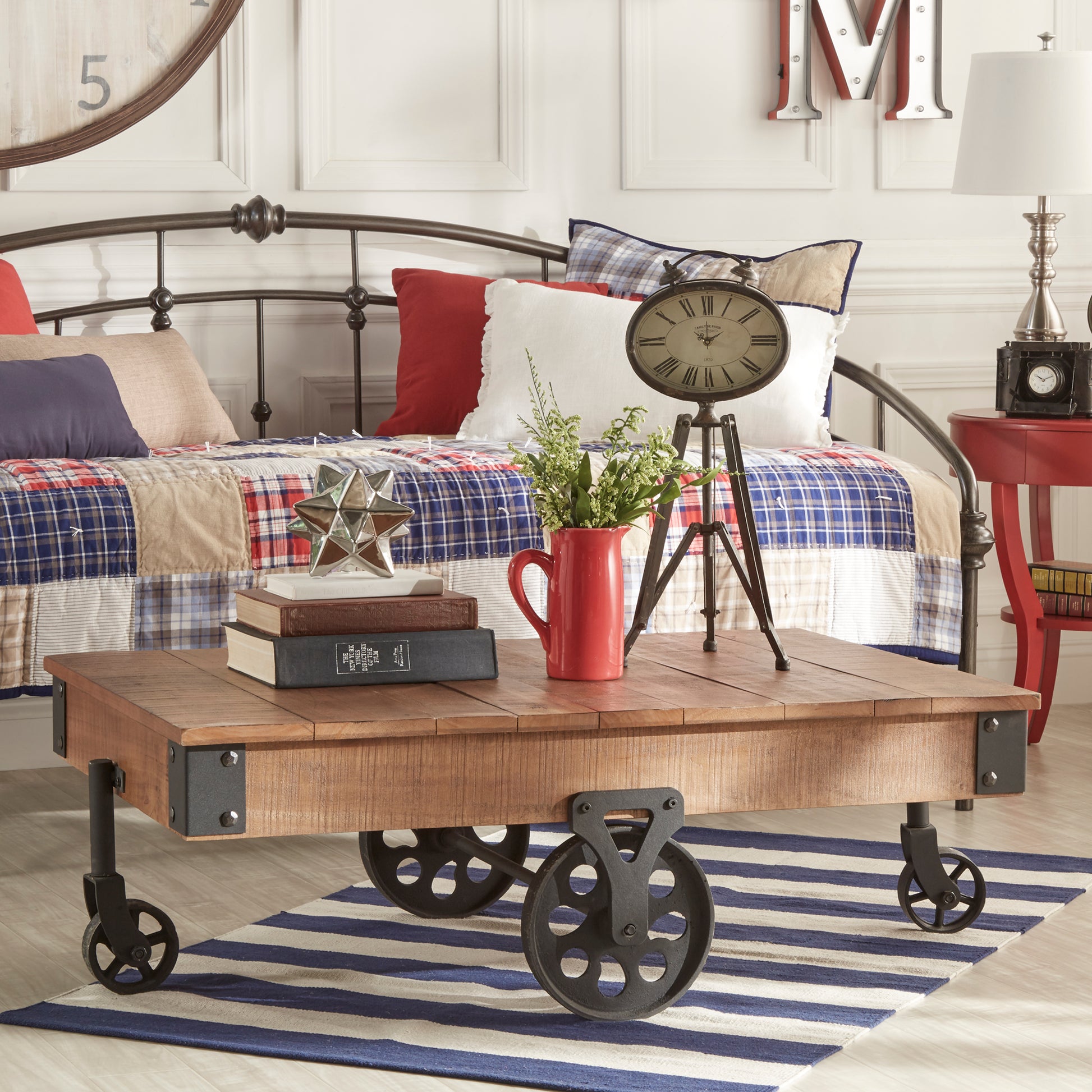 Enjoy a drink with friends while sitting around this iNSPIRE Q Cocktail Table from iNSPIRE Q Classic. The unique table is constructed with a pine top, featuring a weathered patina, allowing traces of the original color and natural wood to show through. The corner hardware and wheels are made with black sanded metal, furthering the vintage feel. Ease of movement is accommodated with the working wheels.