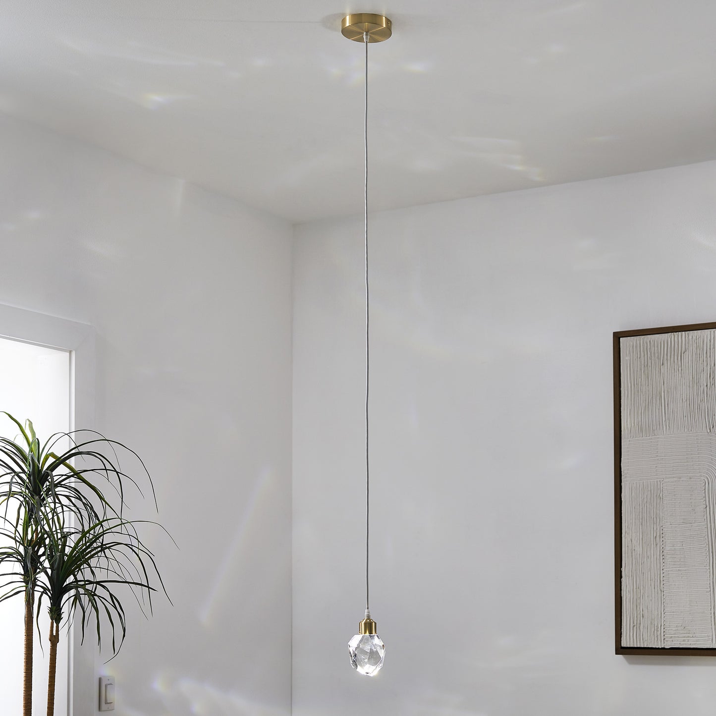 This stunning Crystal Rock LED Pendant / Chandelier is the perfect addition to your kitchen, bar, kitchen island, staircase, entrance, living room, or dining room. The polished brass metal base is corrosion-resistant and durable, while the LED light design is inspired by crystal rock. The high-quality crystal is glittered and translucent, creating an elegant and modern look. The warm white LED light provides a warm and inviting glow. Whether you're entertaining guests or just looking to add some glamour to your space, the Crystal Rock LED Pendant is sure to make a statement.