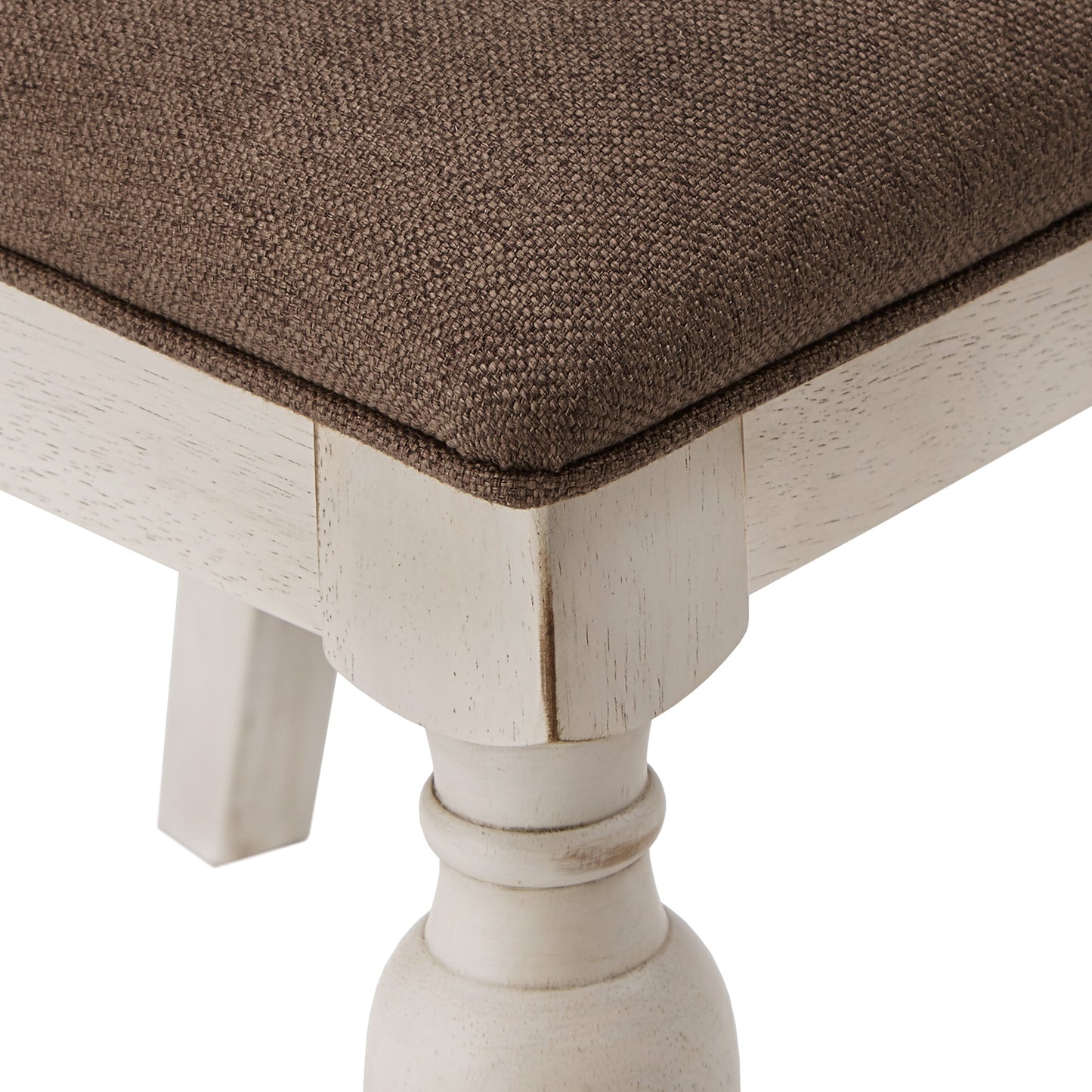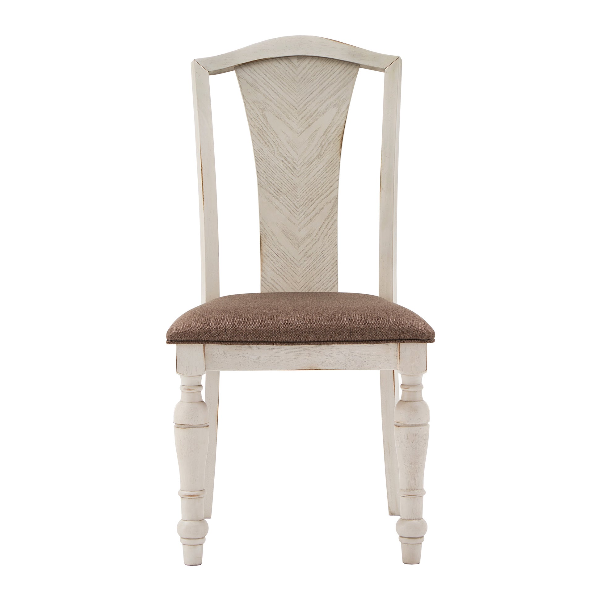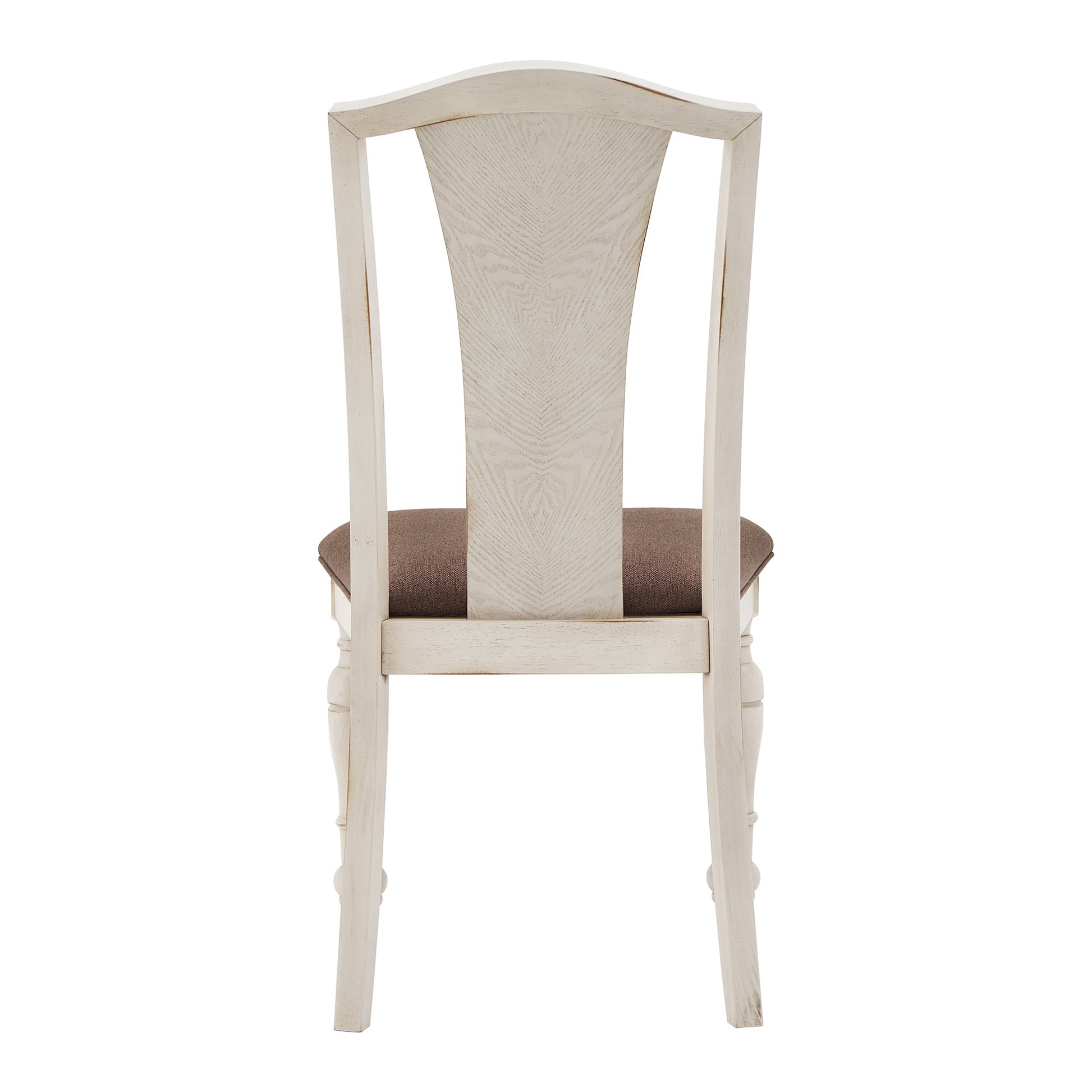 Bring a sense of sophistication to your dining room with these Solid Rubberwood Dining Chairs. This sturdy chair is crafted with the perfect combination of an antique-white finish frame with traditional turned legs and matching wood grain veneer slat back. The padded seat with foam and upholstered in dark brown fabric for lasting comfort at every meal. The elegant design is perfect for studious, family-orientated, or modern living spaces.