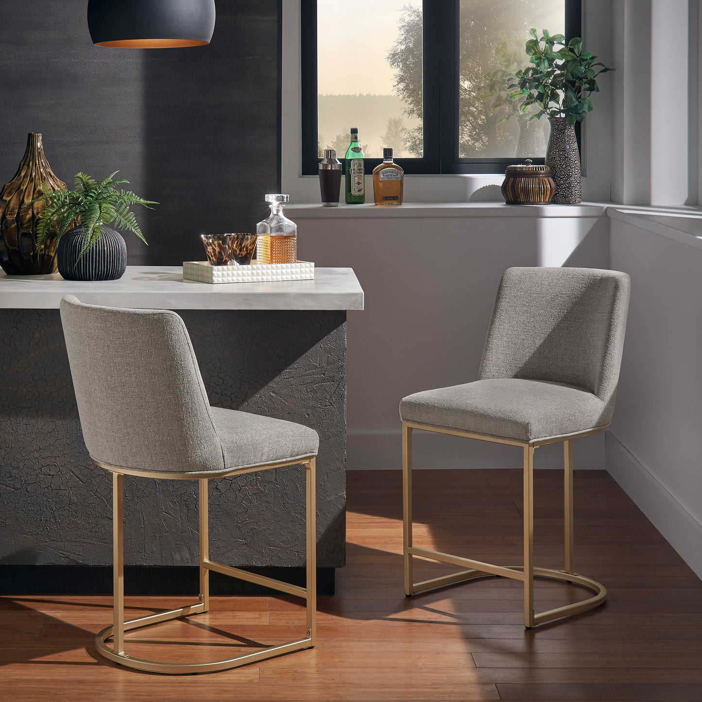 Our Art Deco bar and counter stools have a perfect combination of contemporary design and glam style. The mid-century modern gold finish metal base lends this piece a modern appeal, while the curving back and slim sled legs lend it a sleek, simple elegance. With luxurious heathered weave, soft fabric upholstery, and plush foam cushioning, these bar and counter stools are the perfect places to enjoy your morning coffee or evening drink. The curving back and built-in footrests make them comfortable enough to use as chairs in any room of your home!