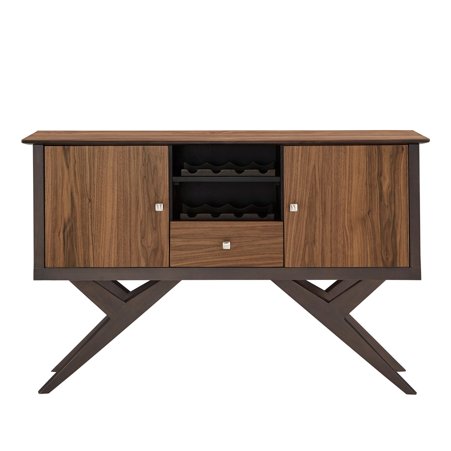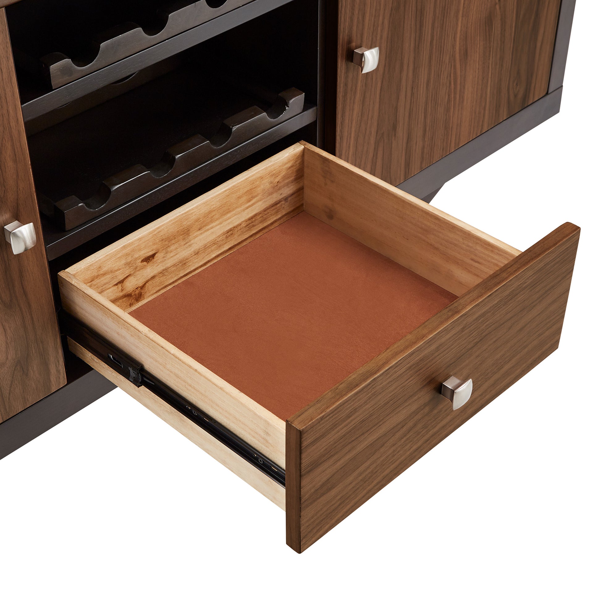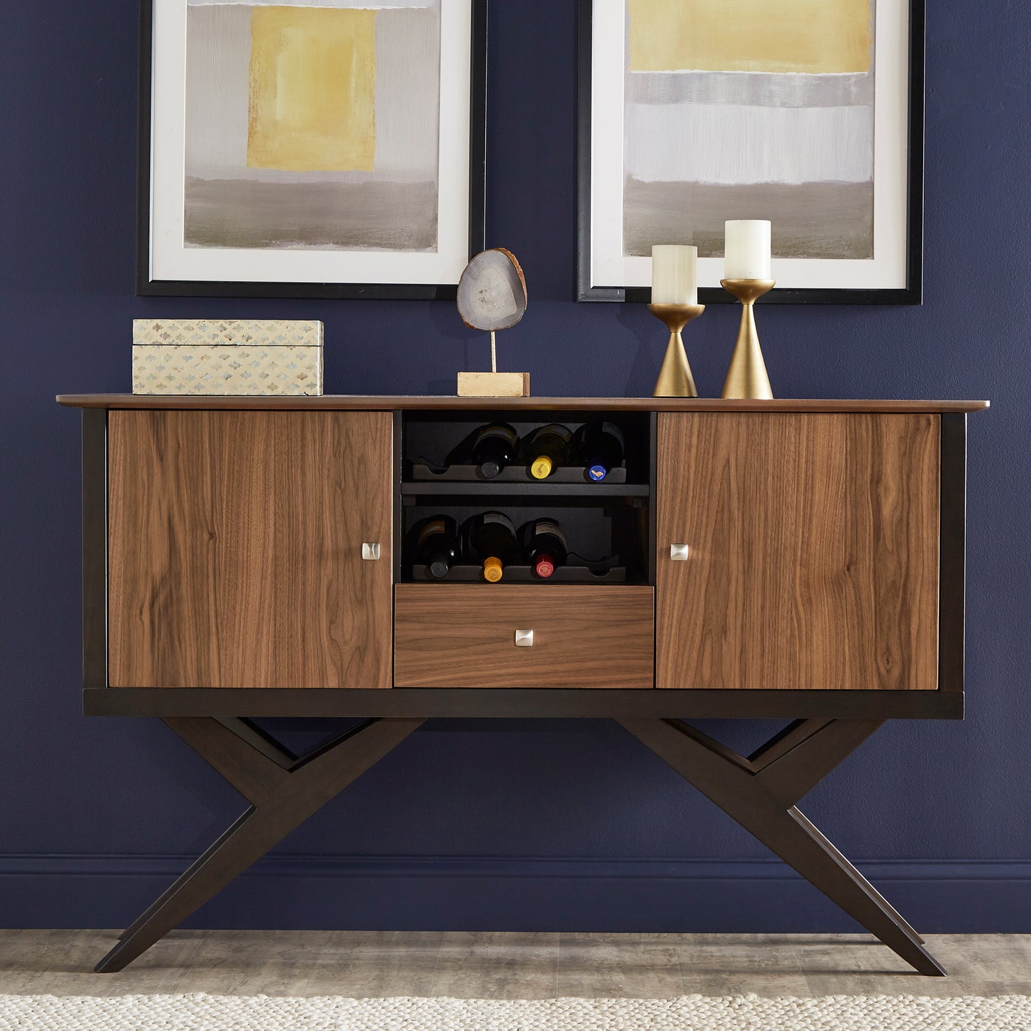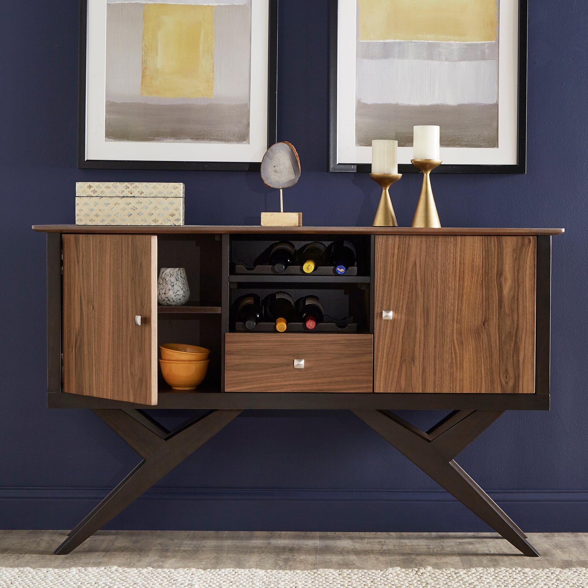 Conveniently store all entertainment essentials with fashion and functionality with the iNSPIRE Q Two-Tone Espresso and Walnut Finish Server from iNSPIRE Q Modern. Storage options are aplenty with this up-to-date server as it comes with two cabinet doors, four total shelves, one drawer, and two removable wine bottle racks. This eclectic server is founded on a sturdy rubber wood and espresso-finished frame while the cabinet doors, drawer front, and table top bear a beautiful walnut finish for a two-tone contrast. Easy to blend with most existing color schemes, set this piece in the entryway or dining room to wow your guests.