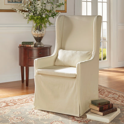 Decorate your space with the statement iNSPIRE Q Wingback Hostess Chair from iNSPIRE Q Artisan. This linen look chair has roomy seating that includes a loose pillow. Choose to have your chair with exposed rubberwood legs or go for a more luxurious look with the alternative slipcover.