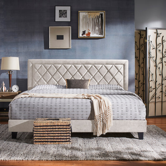 Black Finish Frame with Velvet Fabric Platform Bed - Cream White, King (King Size)
